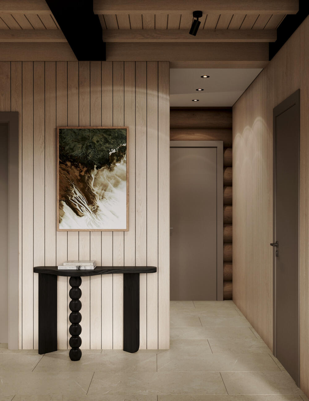 Цветовая палитра построена на нюансных природных оттенках: тёплое дерево, мягкие бежевые тона, светлый камень и спокойная графика чёрных элементов. Такая гамма делает дом цельным на всех этажах, подчеркивает природный характер материалов и создаёт ровное, гармоничное ощущение в каждом помещении.