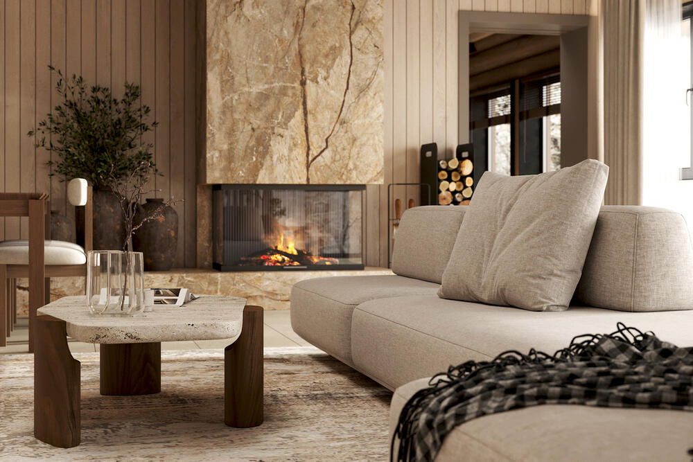 Гостиная спроектирована как место отдыха всей семьи. Мы использовали большой низкий диван, ориентированный сразу в две стороны: с одной — вид на панорамные окна и лес, с другой — ТВ-зона и камин. Такое решение делает пространство гибким: можно смотреть кино, читать у окна или наблюдать за снегопадом за стеклом.