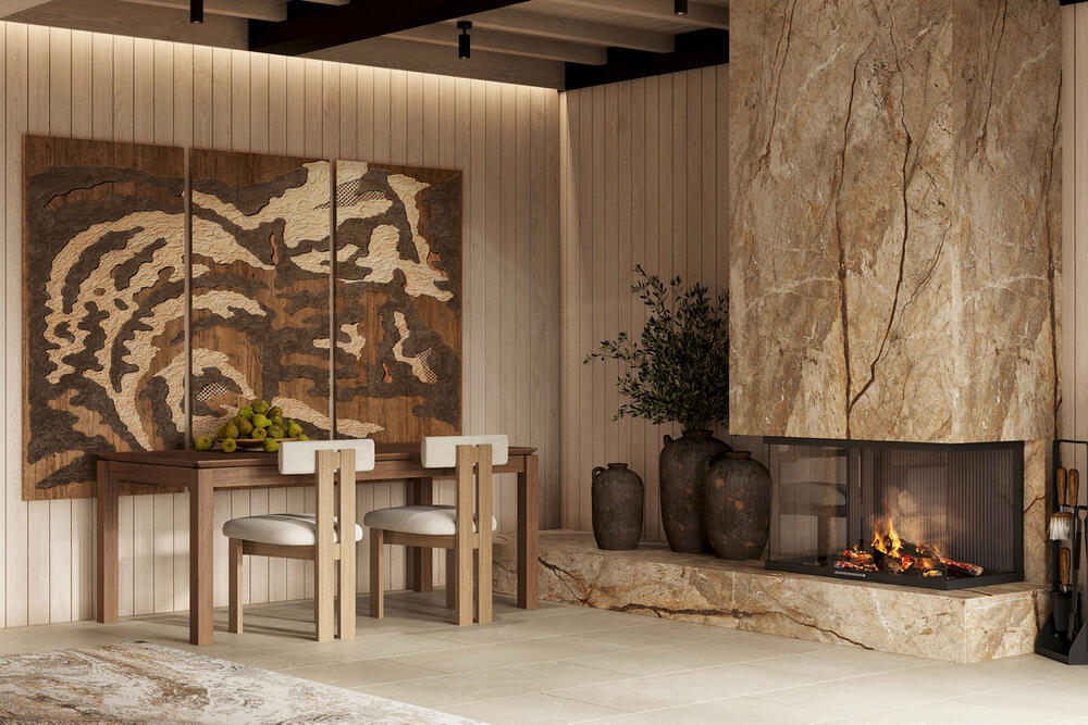 Крупноформатный керамогранит под камень — применён на кухонном острове и фартуке, в зоне камина и в санузлах. Он визуально собирает большие плоскости, добавляет интерьеру монолитности и легко выдерживает влажность, перепады температуры и активное использование.