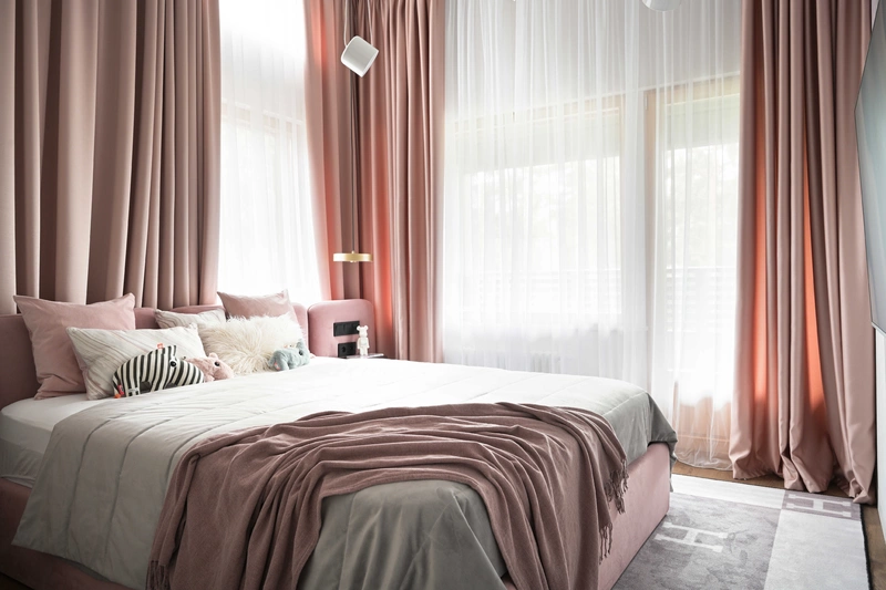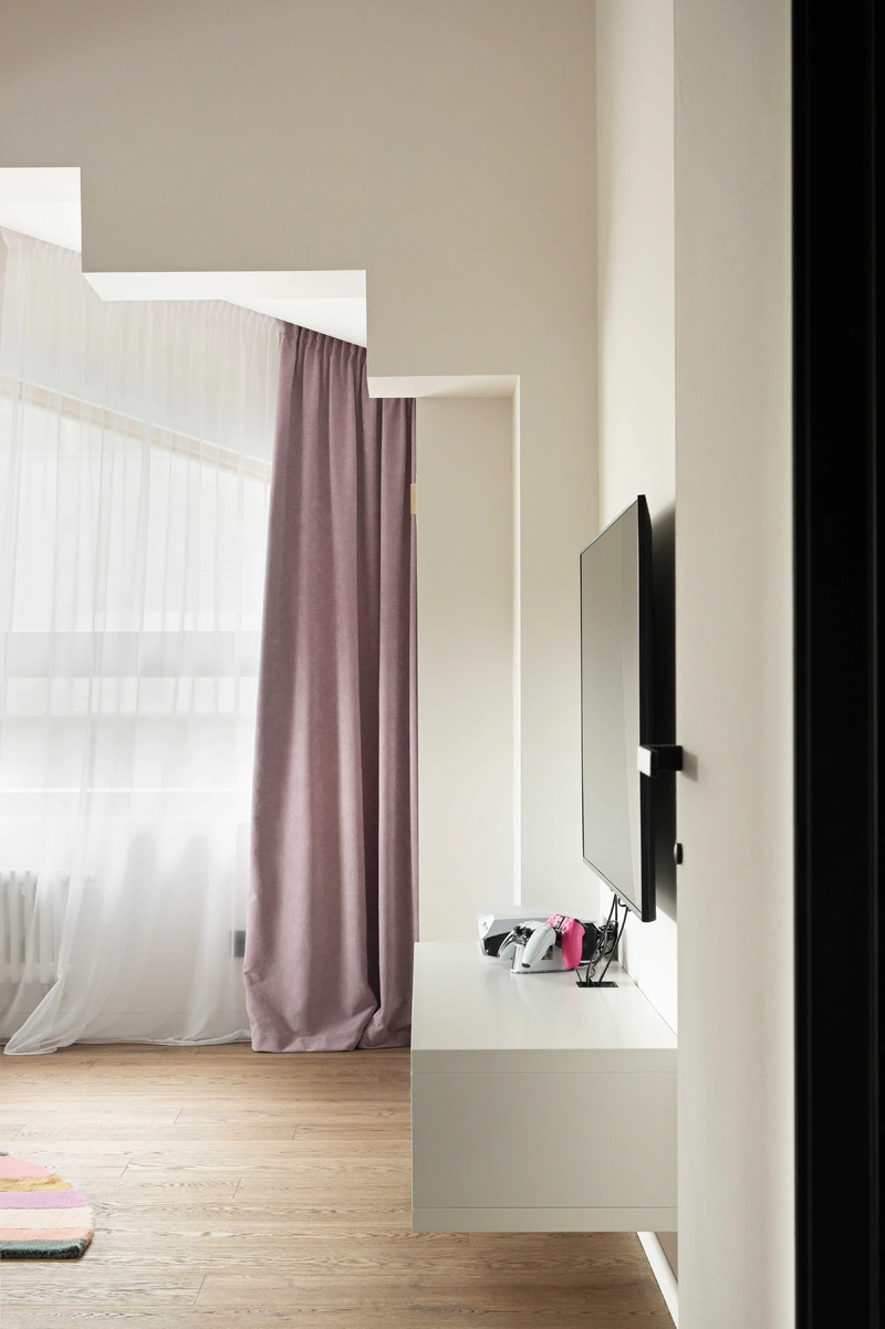 Большие окна пропускают много естественного света, а воздушные шторы из легкого тюля смягчают освещение. Напротив кровати размещена ТВ-зона с лаконичной консолью и стильной акустической системой.