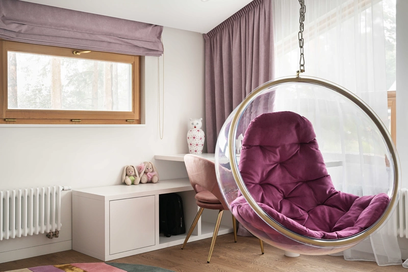 Ключевой акцент – подвесное кресло-кокон с прозрачными стенками. Оно создаёт эффект невесомости и становится идеальным местом для отдыха, чтения или игр.