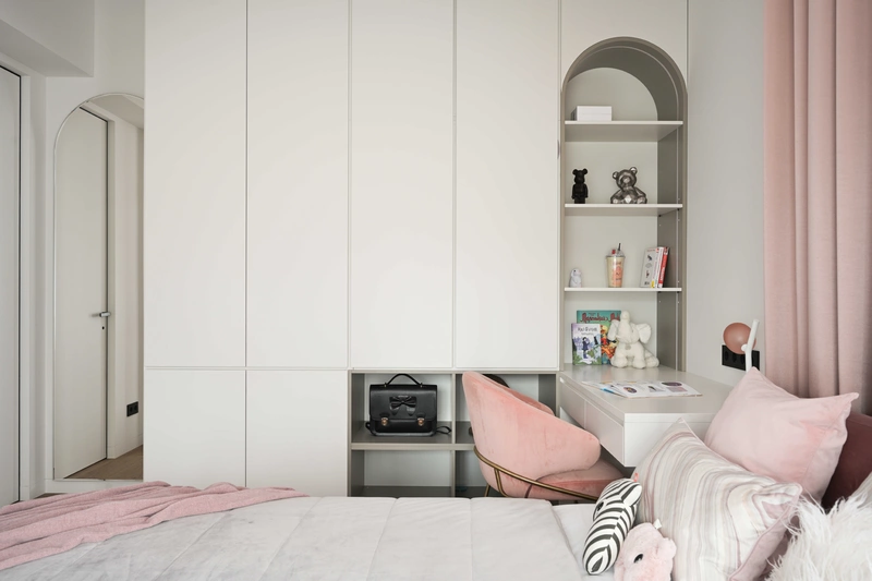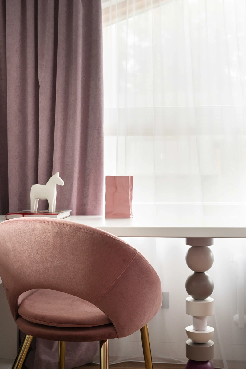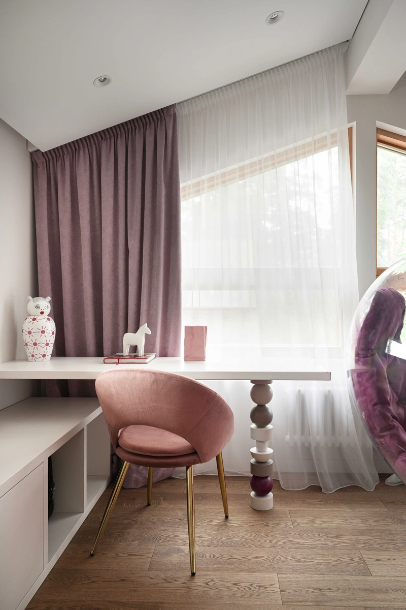 Рабочая зона выполнена в лаконичном стиле, но при этом остаётся функциональной. Стол с декоративной ножкой в виде геометрических сфер выглядит необычно, а удобный стул и мягкий пуф делают пространство эргономичным. Рядом – компактная встроенная скамья с местом для хранения игрушек и аксессуаров.