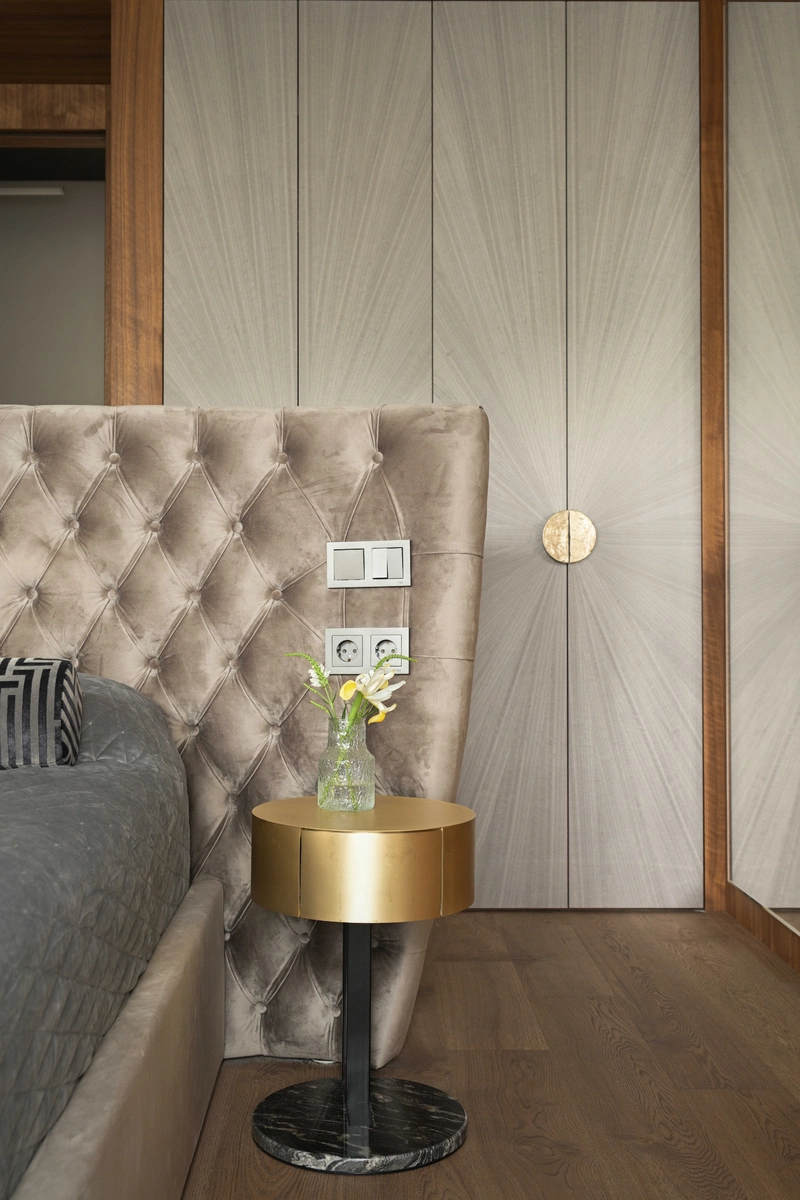 С двух сторон от кровати расположены компактные прикроватные тумбы с элегантными светильниками, выполненными в латунной отделке.