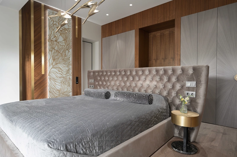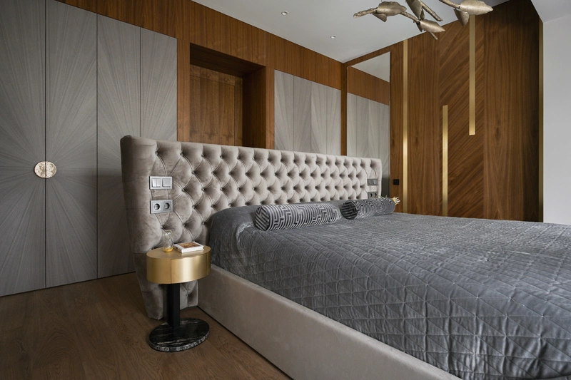 Кровать расположена прямо по центру помещения. Высокое мягкое изголовье кровати, которое не только подчеркивает статусность интерьера, но и формирует уютную зону отдыха.