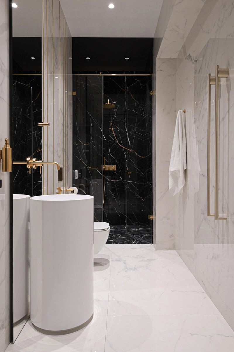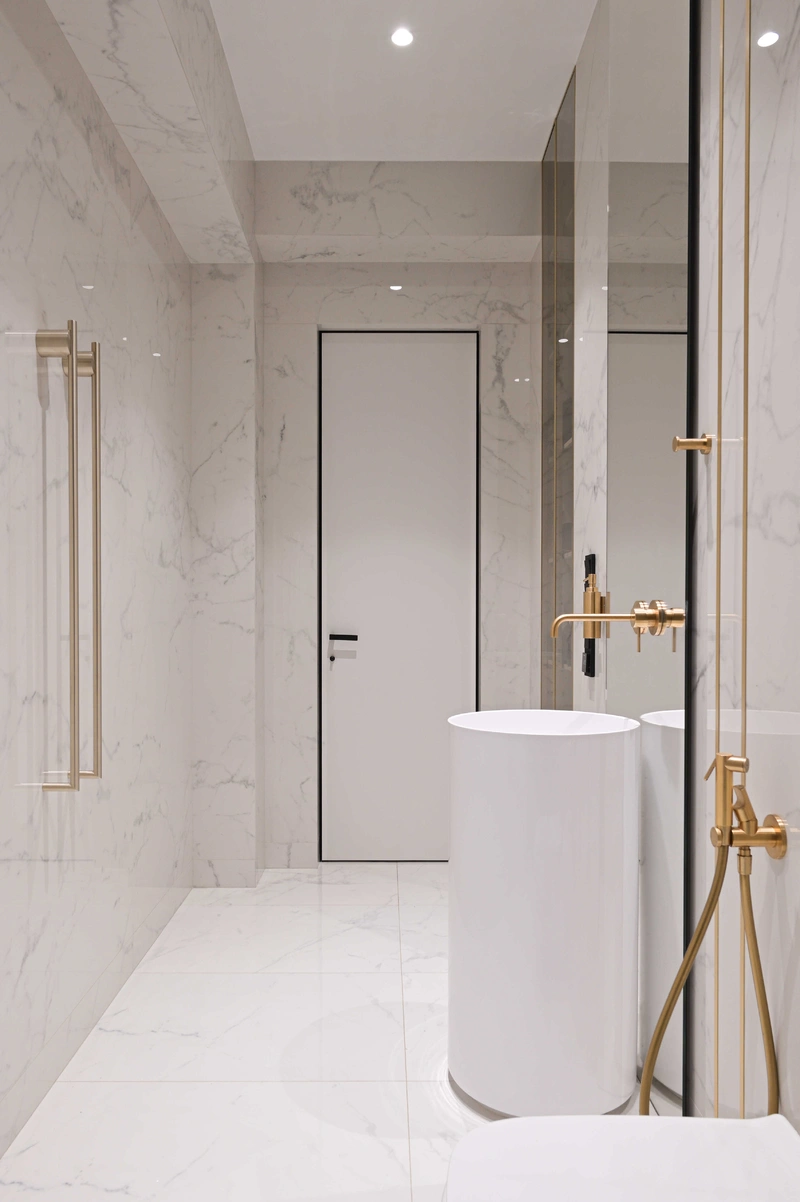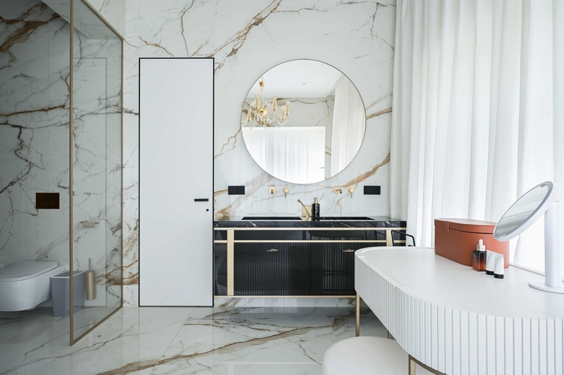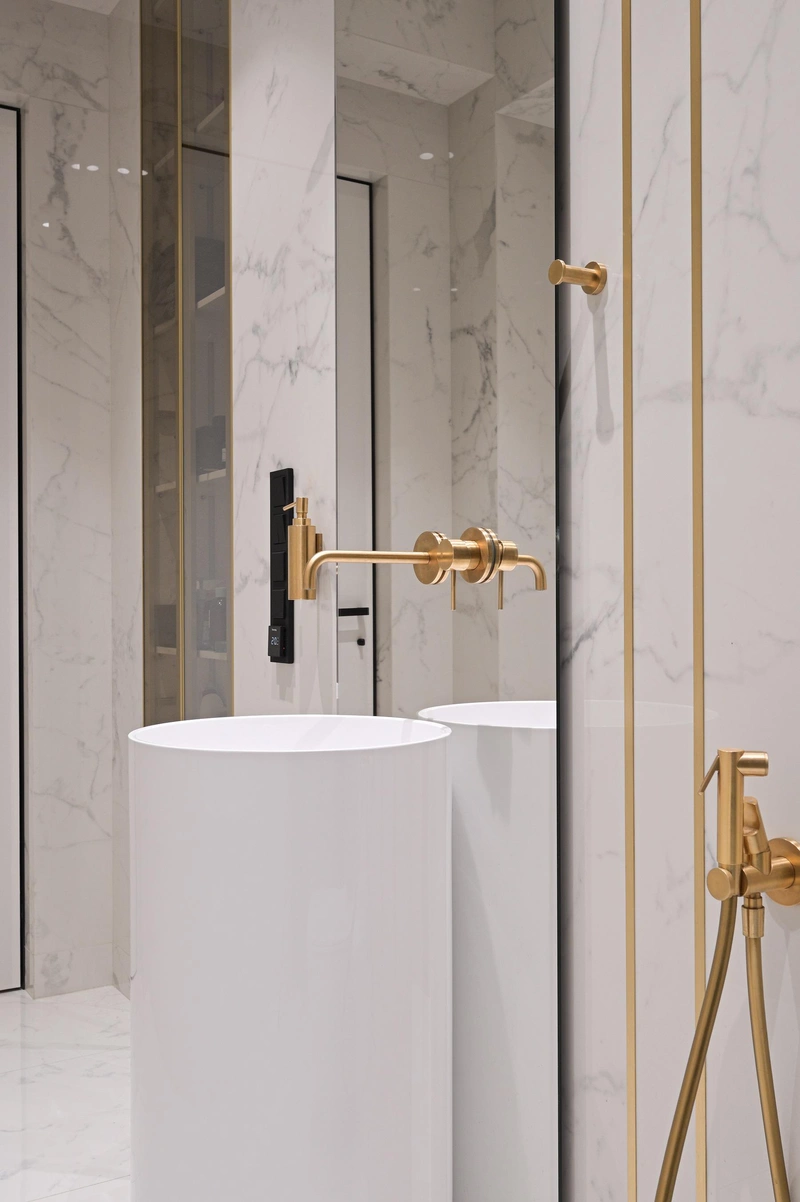 Эта ванная комната выдержана в элегантных светлых тонах с тонкими золотыми акцентами. Отделка выполнена из крупноформатного мрамора с выразительным природным рисунком, что придаёт пространству статусность и гармонию.