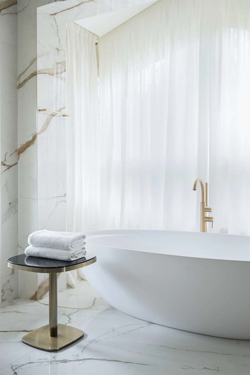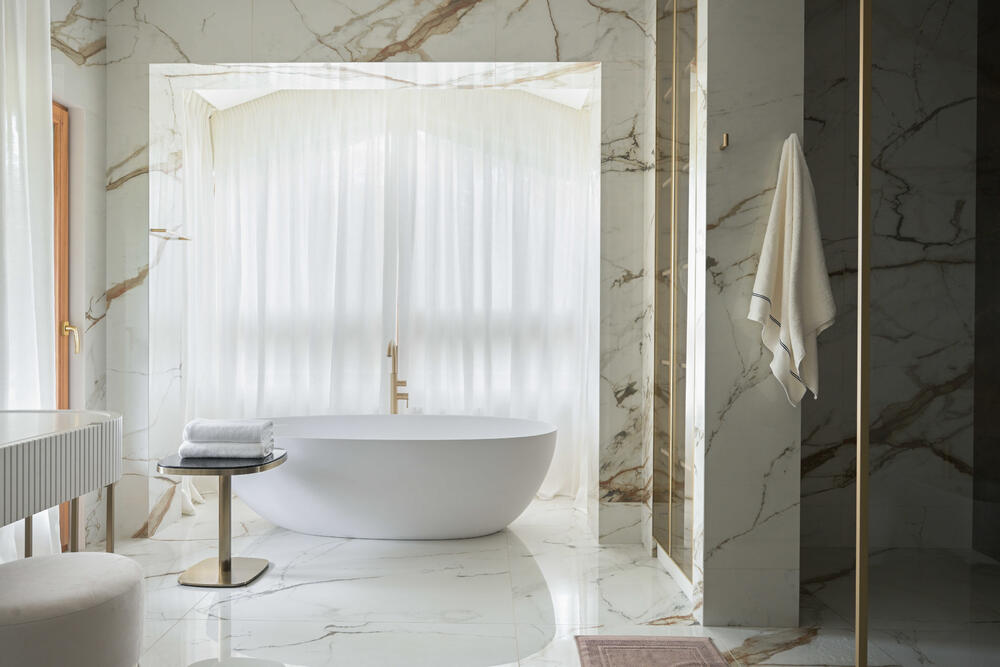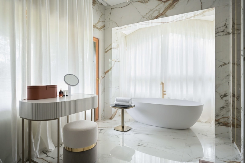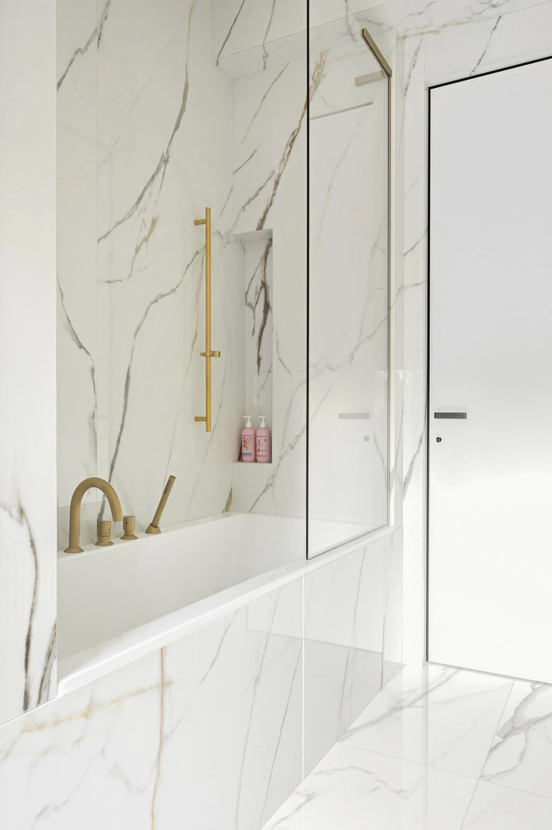 Эта ванная комната выдержана в элегантных светлых тонах с тонкими золотыми акцентами. Отделка выполнена из крупноформатного мрамора с выразительным природным рисунком, что придаёт пространству статусность и гармонию.