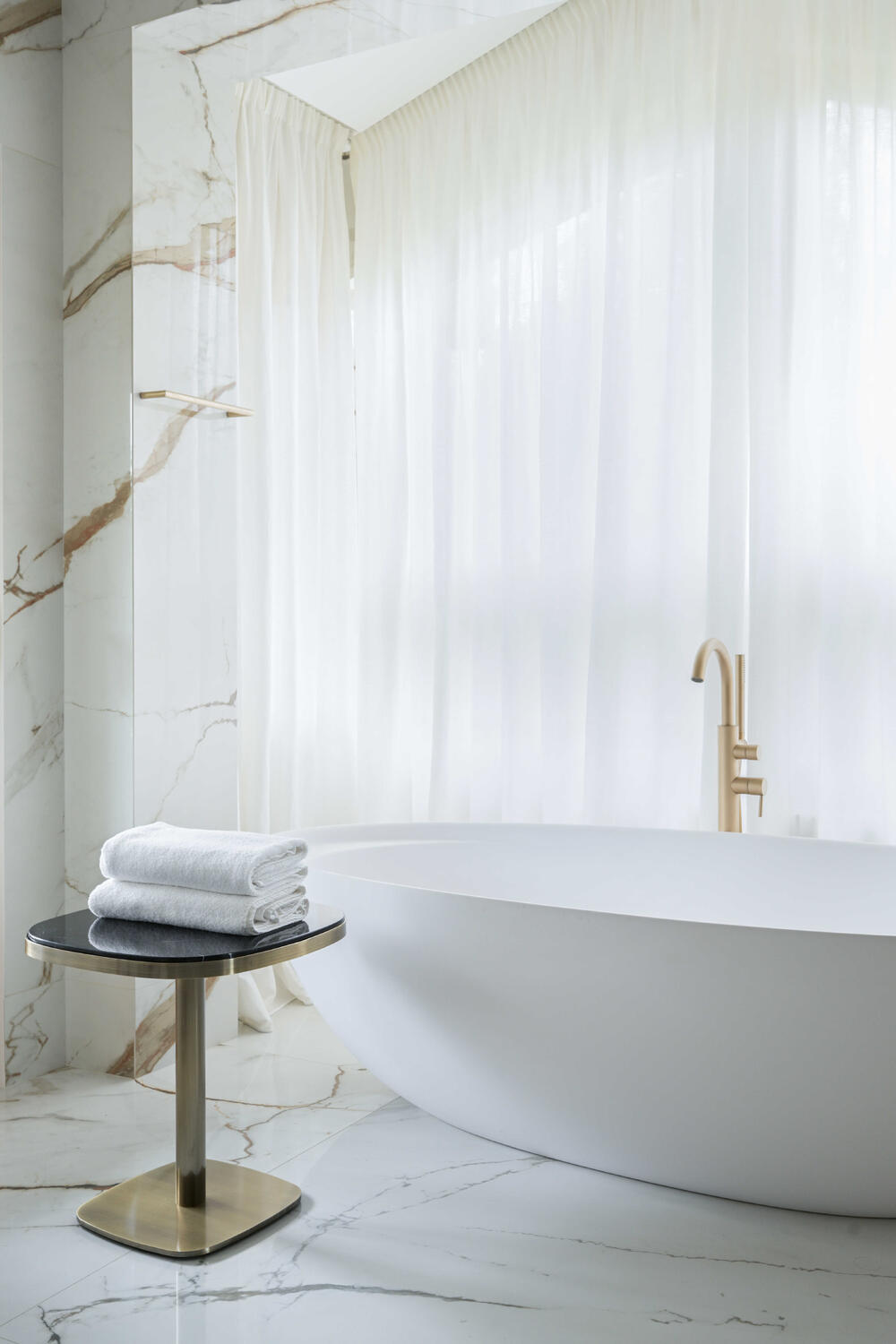 Свободно стоящая ванна расположена у панорамного окна, из которого открывается вид на окружающий ландшафт. Рядом предусмотрена зона для отдыха — мягкий пуф и консольный столик, где можно разместить свечи, ароматы и предметы декора.