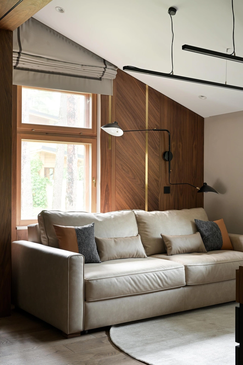 Дизайн выдержан в сдержанной натуральной палитре с акцентом на текстуры: глубокие древесные оттенки, бархатистые ткани и тёплые металлы.
