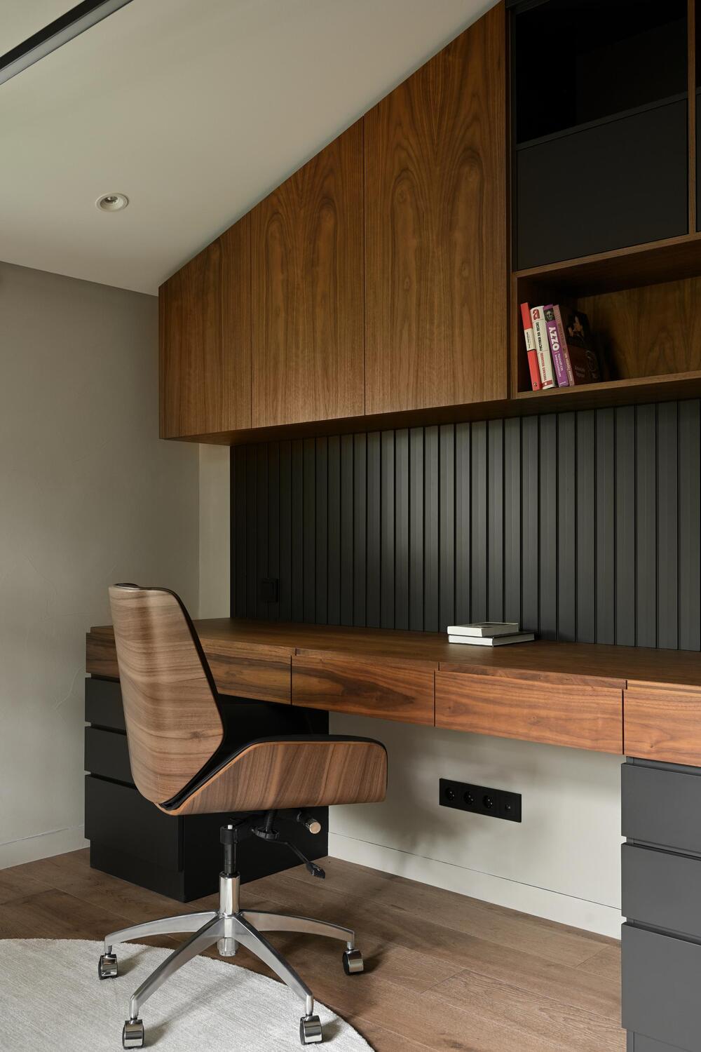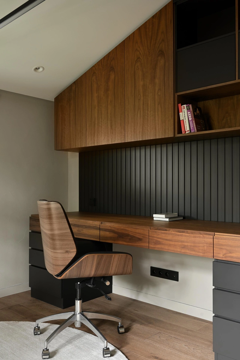 Кабинет выполнен в спокойных древесных оттенках, создающих концентрацию и рабочее настроение. В центре — стол из натурального шпона с удобным офисным креслом.