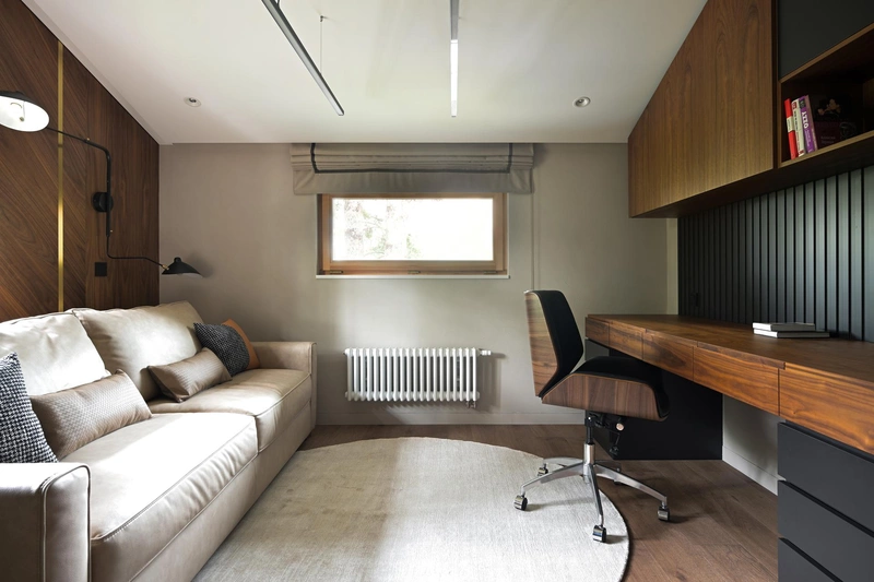 Мягкий диван в зоне отдыха делает кабинет многофункциональным, позволяя использовать его не только для работы, но и для расслабления в уютной атмосфере.