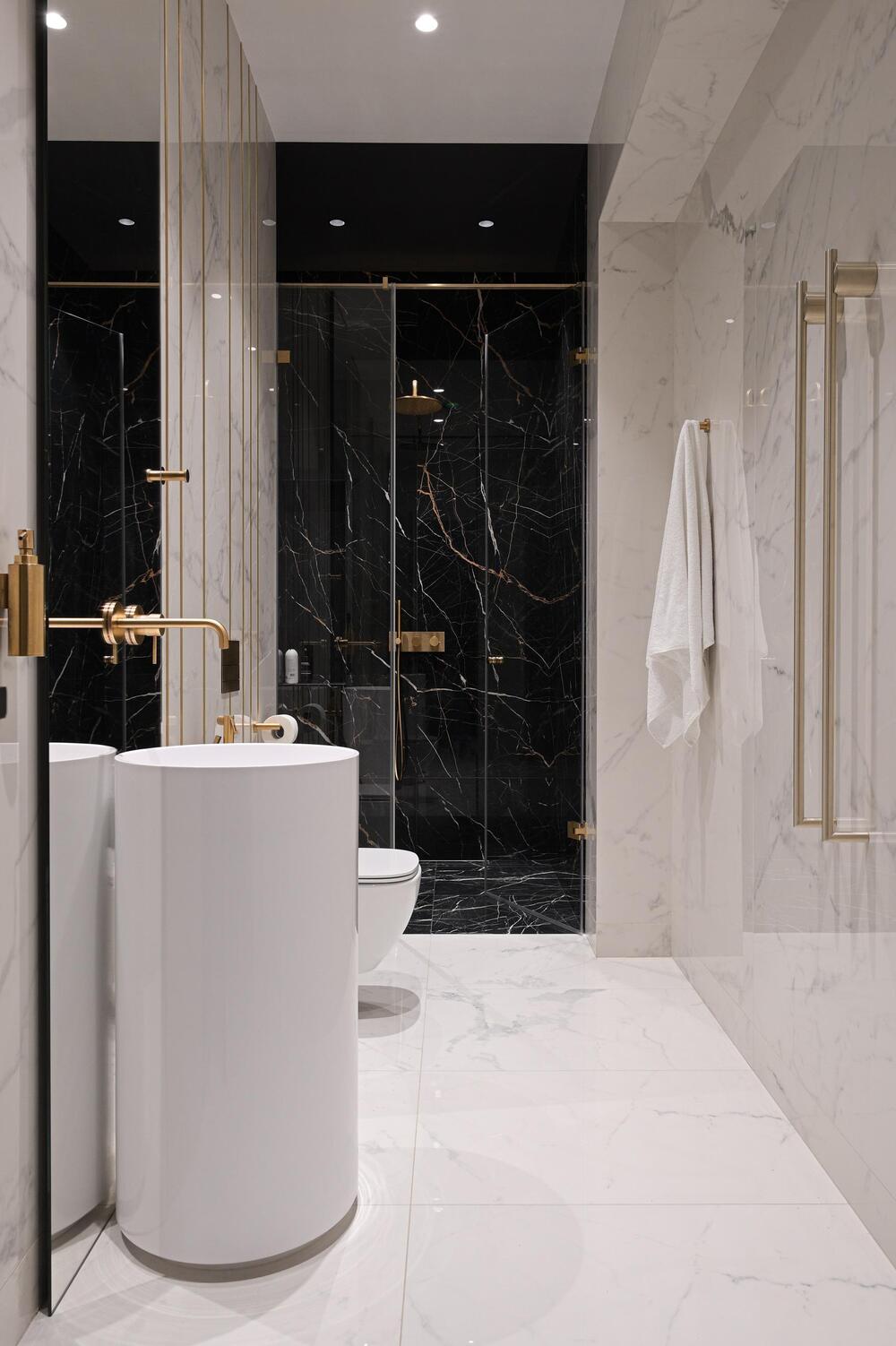 Душевая зона оформлена в контрастных оттенках светлого и тёмного мрамора.