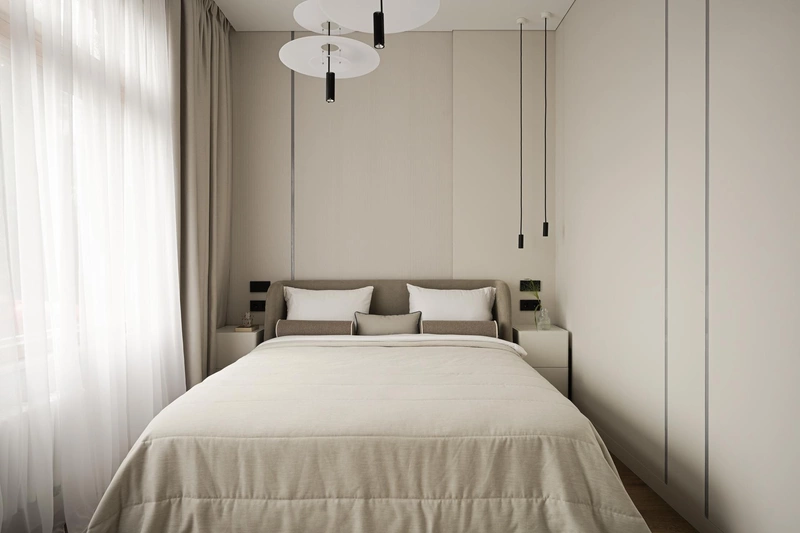 Спальня оформлена в спокойных нейтральных тонах, создающих атмосферу релакса.