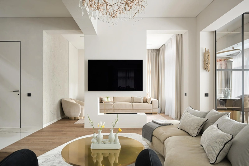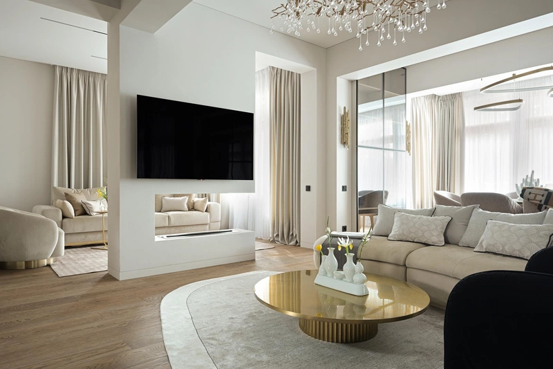 ТВ-зона в этом проекте не просто стена с экраном, а место для расслабления. Мягкая мебель расположена так, чтобы каждый член семьи мог комфортно устроиться перед экраном, а уровень освещения настроен таким образом, чтобы не создавать бликов и зрительного напряжения.