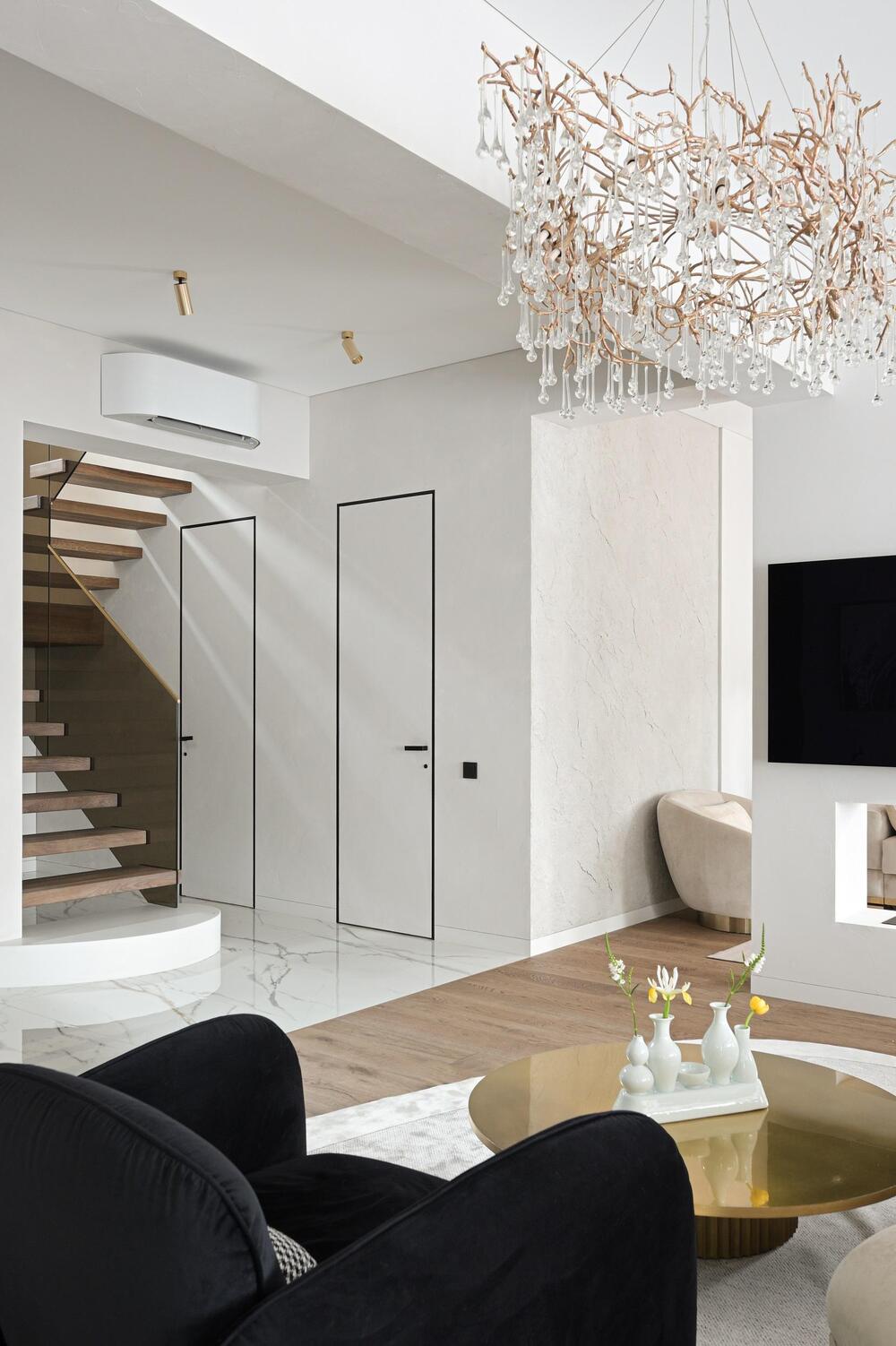 Пространство холла оформлено в той же светлой палитре, что делает его логичным продолжением прихожей. Высокие потолки и панорамные окна добавляют ощущение простора.