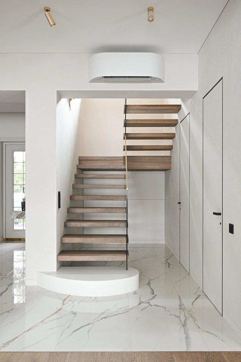 Прихожая — это визитная карточка дома, и в этом проекте она сразу создаёт правильное настроение. Пространство оформлено в светлых природных оттенках.