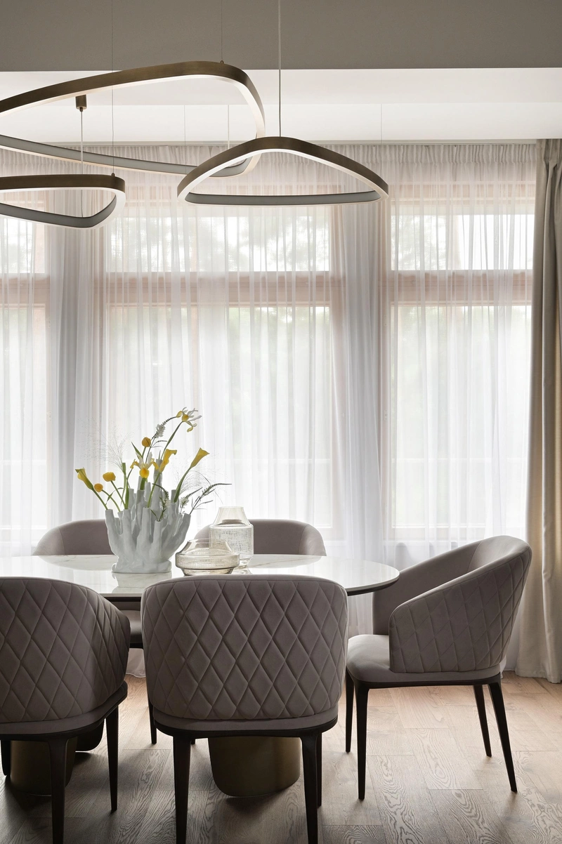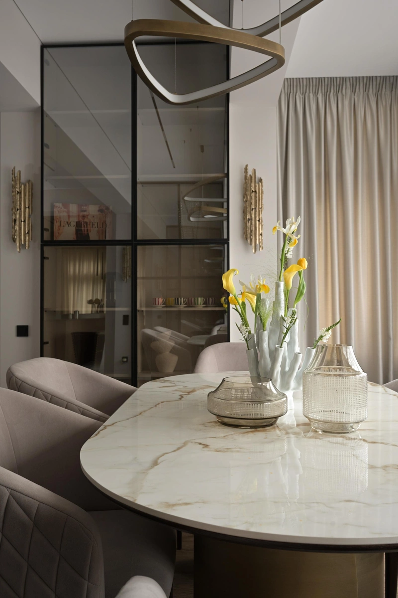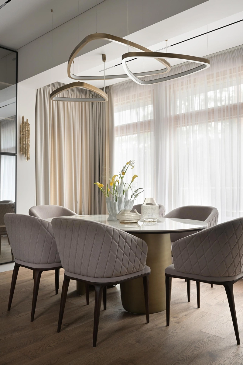 В центре внимания — роскошный обеденный стол с каменной столешницей и мягкие стулья с текстильной обивкой. Такое сочетание не только выглядит элегантно, но и гарантирует комфорт даже для долгих семейных ужинов.
