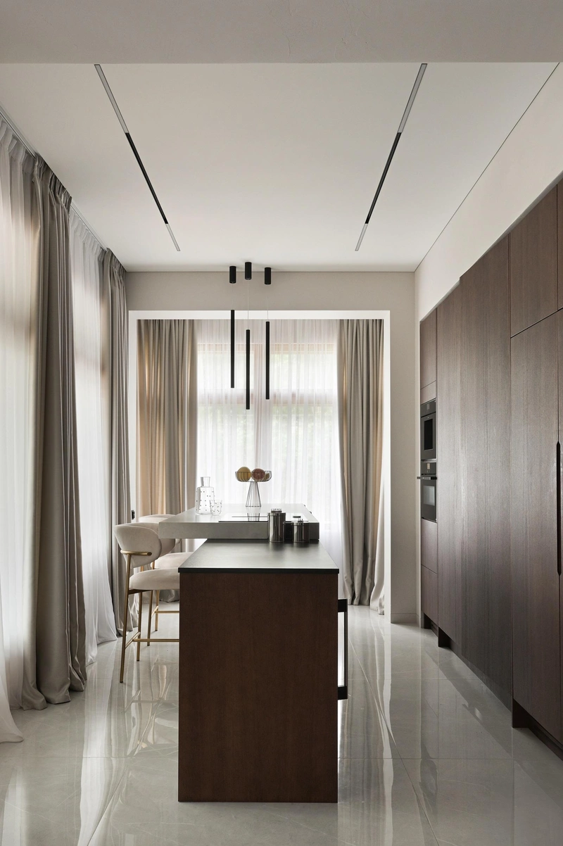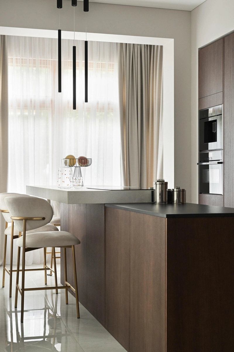 Здесь закрытые системы хранения скрывают кухонную утварь, сохраняя визуальную чистоту пространства. Верхние шкафы выполнены в натуральном шпоне тёплого оттенка, нижние — в лаконичном матовом покрытии. Такое сочетание создает стильный контраст и делает интерьер более глубоким.