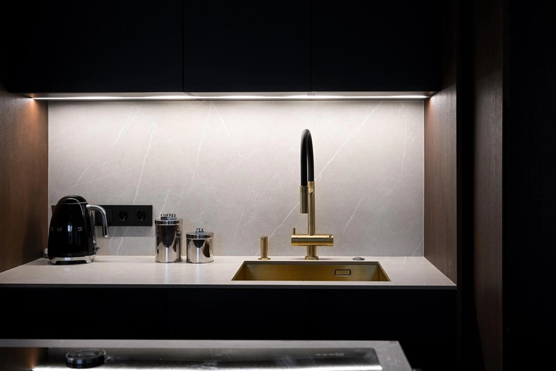 Рабочая поверхность из натурального камня устойчива к нагрузкам, а встроенная бытовая техника делает процесс приготовления комфортным и быстрым.