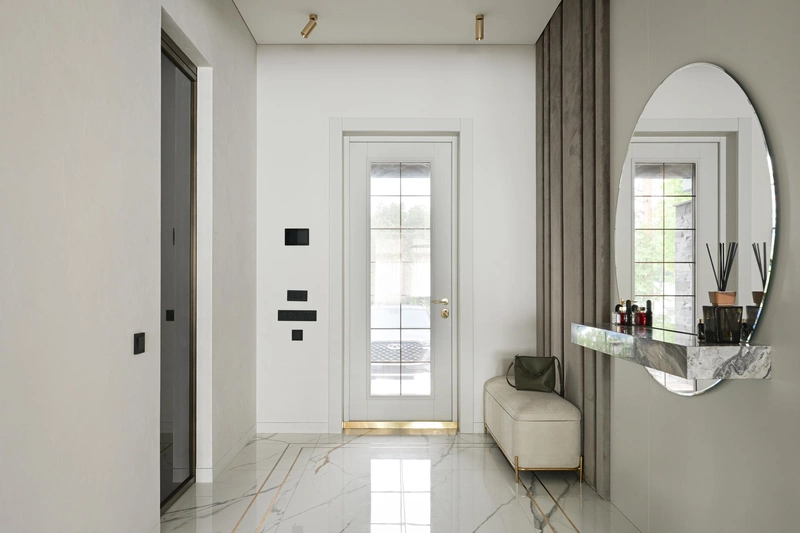 Пол выполнен из керамогранита с мраморной текстурой, что не только выглядит элегантно, но и практично в уходе — грязь и влага с обуви не портят покрытие.