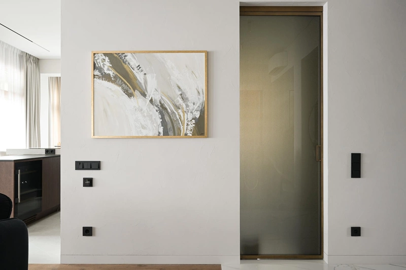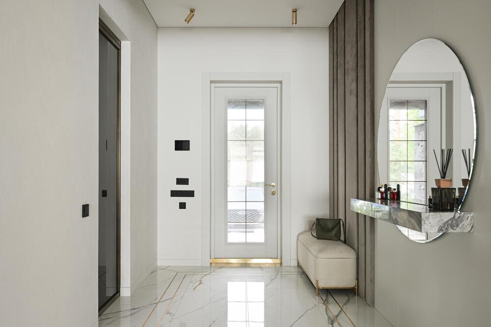 Входная группа встречает просторной прихожей с вместительными системами хранения, где нет хаоса из обуви и пальто, зато есть зеркальные панели, визуально расширяющие пространство. Холл плавно ведёт в гостиную: благородные оттенки, фактурные материалы, тёплое освещение и идеальный баланс между классикой и современностью.