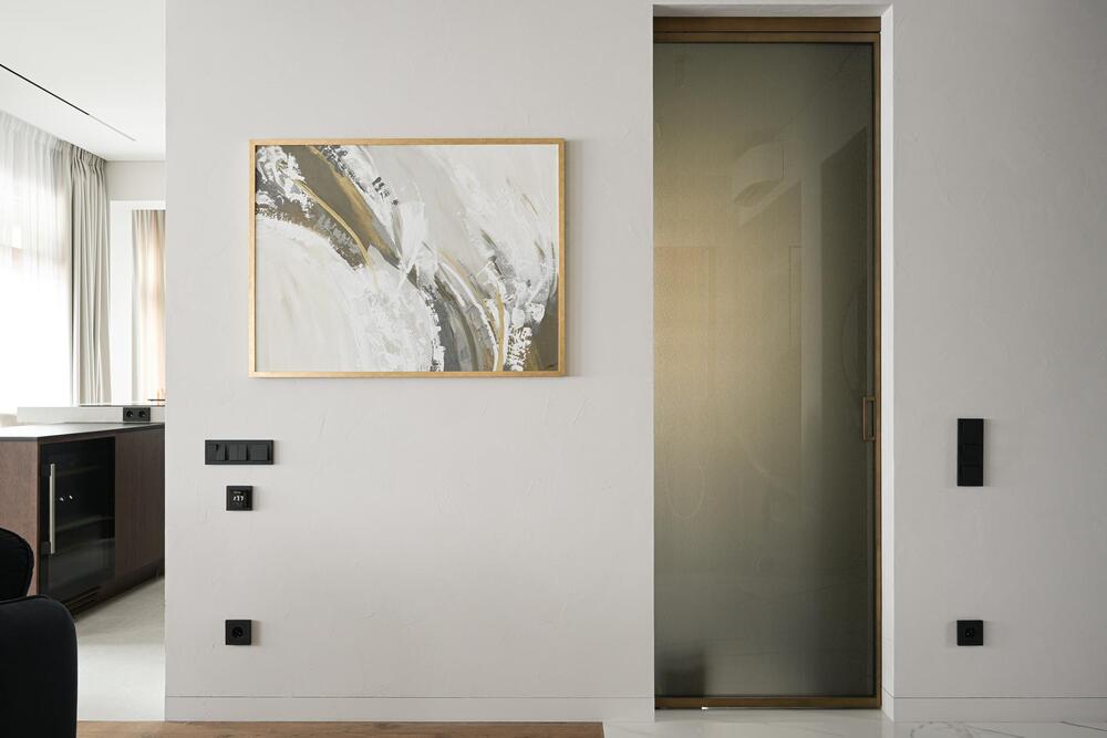 В основном холле дома есть очень интересная деталь. Это стеклянные откатные перегородк. Профиль выполнен из латуни. Декорировано это полотно тканью. Ткань запечатана между двух стекол. Это сложное техническое решение, которое мы воплотили в этом проекте.