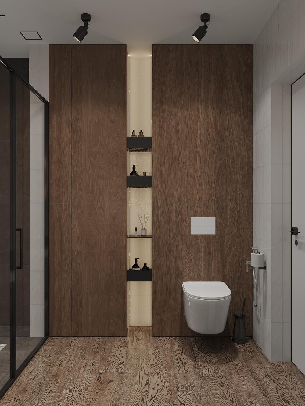 Подвесной унитаз с инсталляцией экономит место и облегчает уборку, а встроенные ниши в душевой позволяют хранить косметику и аксессуары без лишних полок. Санузел получился светлым, удобным и стильным — идеальное решение для гостей.