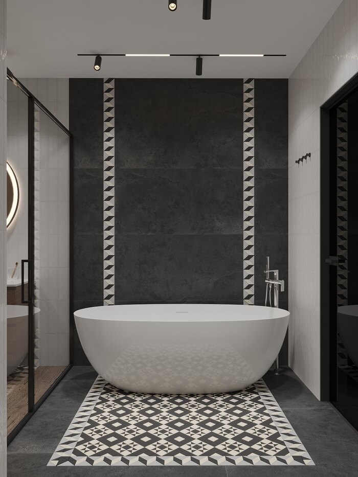 - Метлахская плитка — акцентный элемент на полу и стенах, повторяется в разных помещениях, создавая общий ритм.