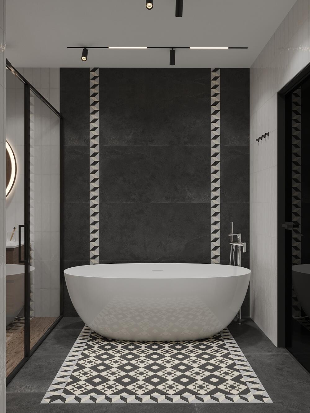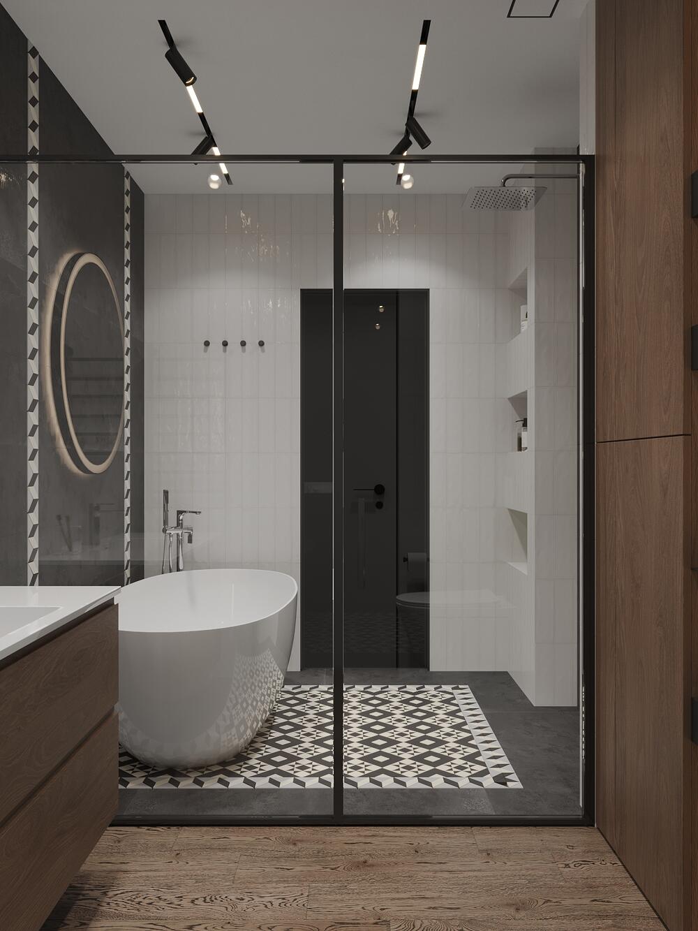 Все помещения связаны единой цветовой гаммой и повторяющимися материалами, что создаёт целостный образ. В ванной комнате ванна и душ разместились в одной стеклянной зоне, а гостевой санузел получил акцентную плитку и удобное хранение.