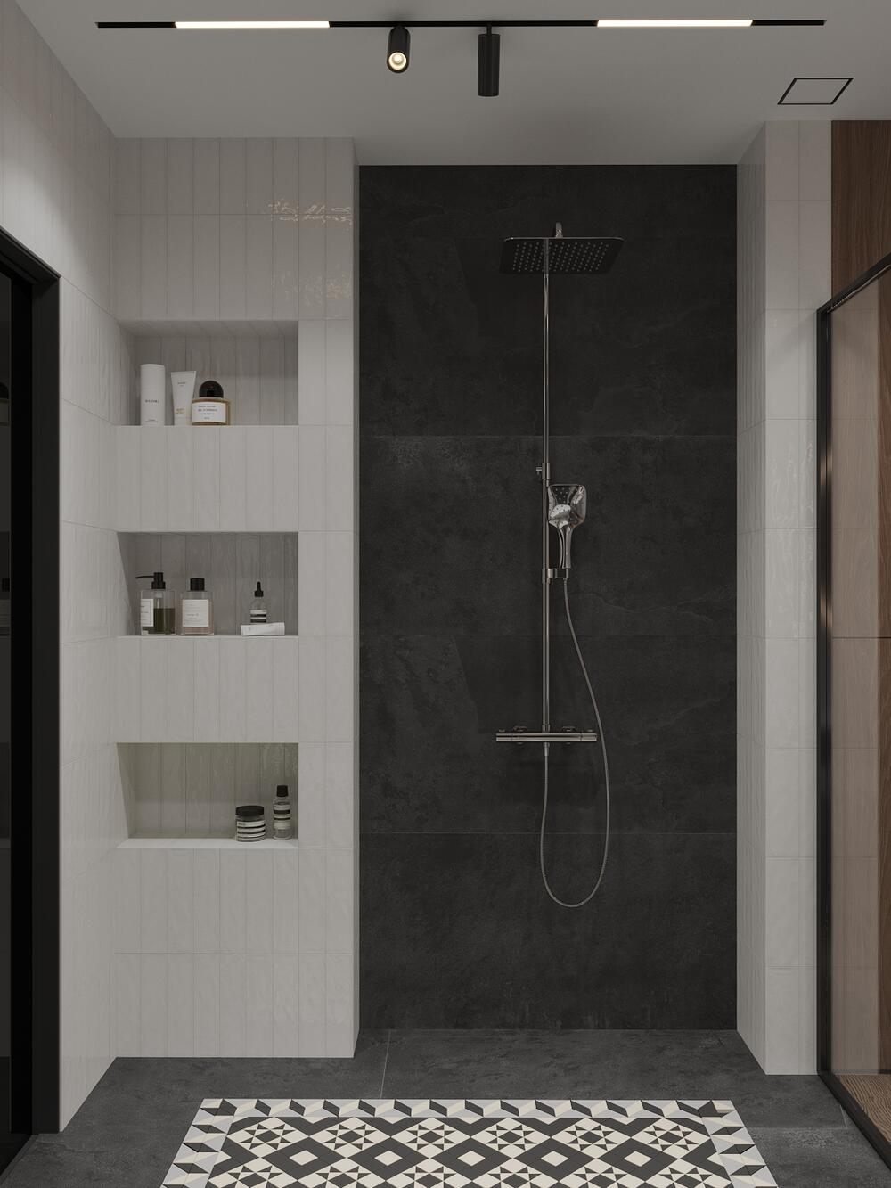 Зона душа отделана в тёмных тонах, а ванна — на фоне светлой плитки, что помогает зрительно разграничить пространство. Встроенные ниши в душевой позволяют хранить все необходимые аксессуары без лишних полок.