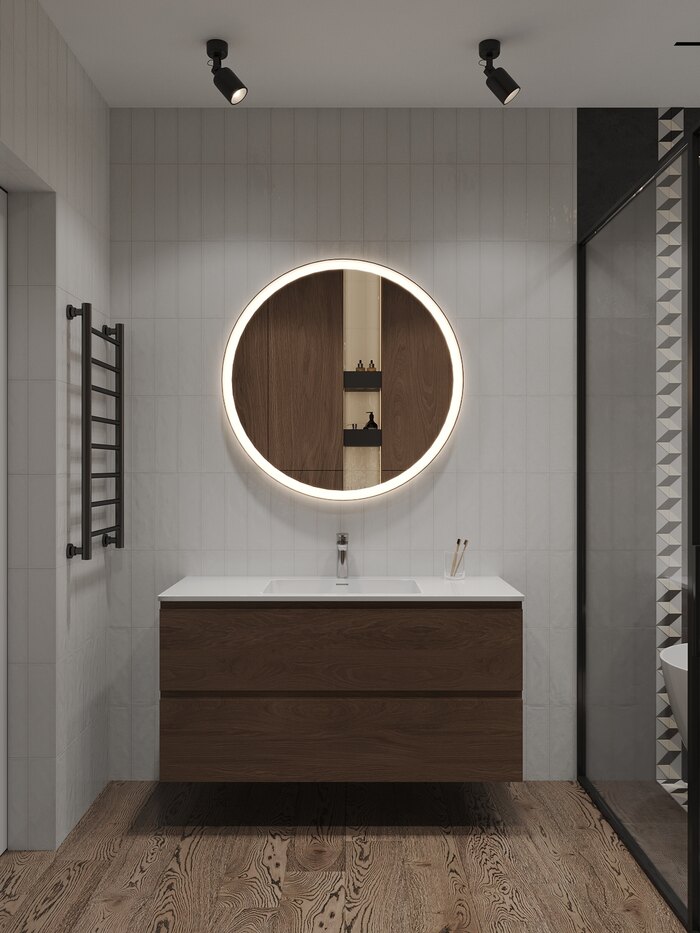 С одной стороны установлена подвесная тумба с двойной раковиной и круглым зеркалом с подсветкой, с другой — система хранения за деревянными фасадами и инсталляция унитаза. Тёплое напольное покрытие из влагостойкой инженерной доски делает комнату приятной на ощупь и уютной даже зимой.