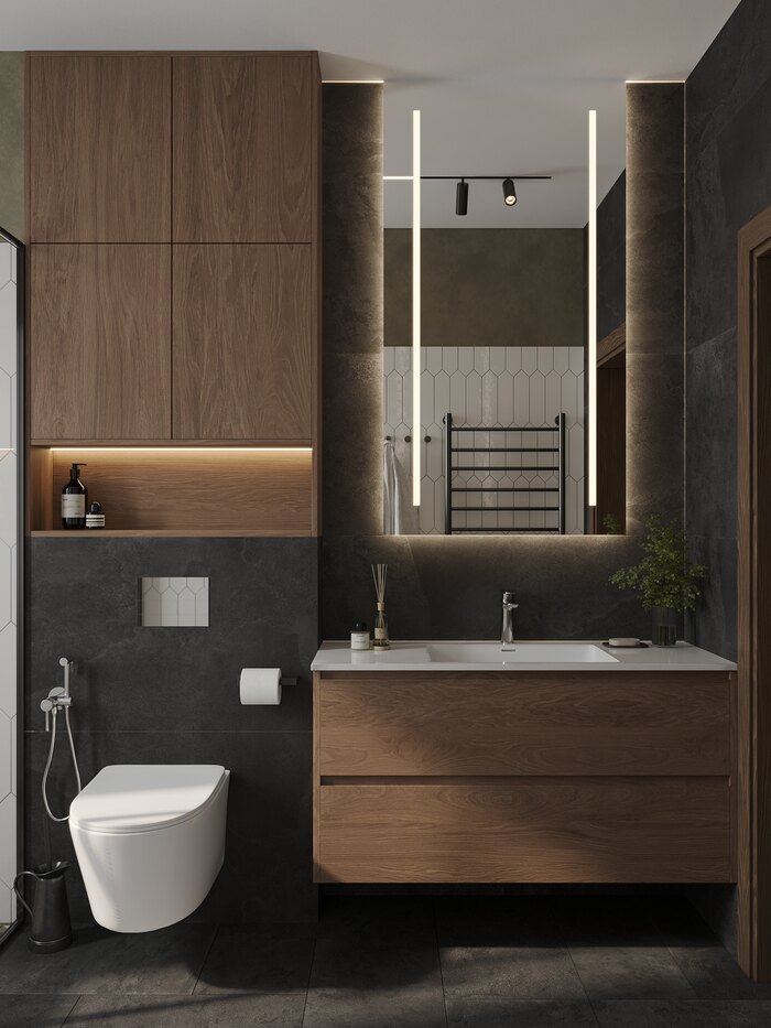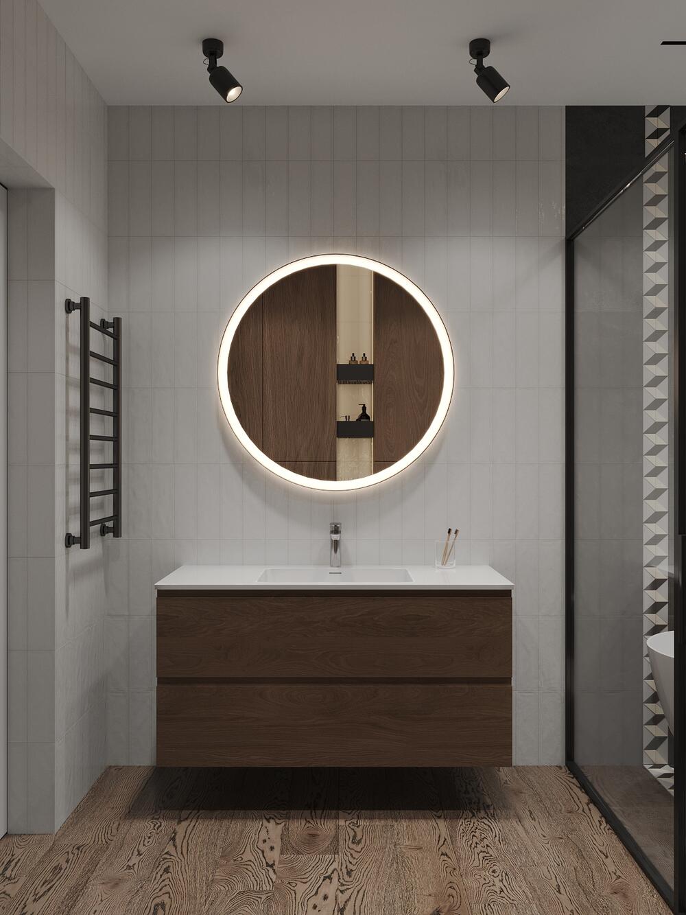 Гостевой санузел сделали компактным, но очень функциональным. В одной линии разместили подвесную тумбу с раковиной, зеркало с подсветкой и систему хранения за фасадами из дерева. Всё необходимое легко достать, а интерьер остаётся аккуратным.