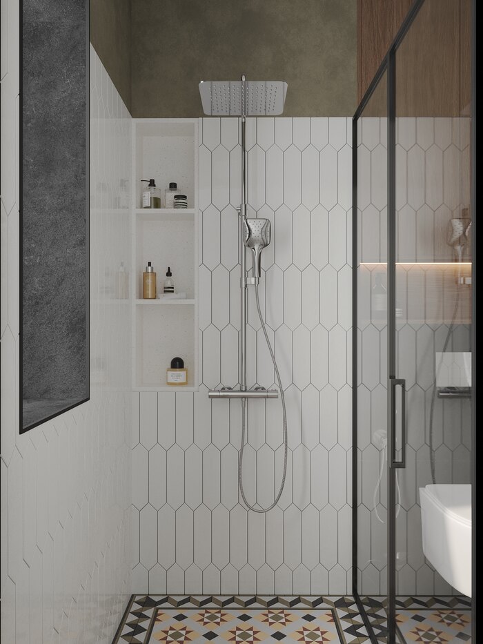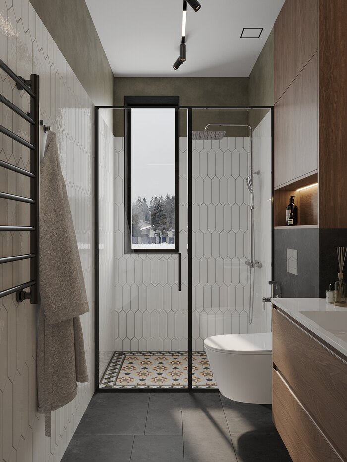 Душевая зона выделена стеклянной перегородкой и оформлена светлой плиткой с вертикальным рисунком, на полу — метлахская плитка с ярким узором, который стал акцентом. Такое решение перекликается с отделкой в других зонах дома и создаёт общий ритм.
