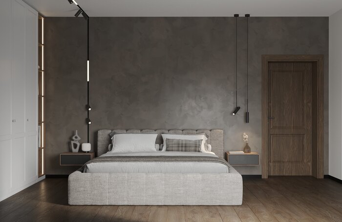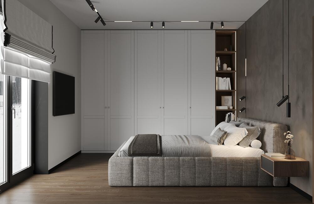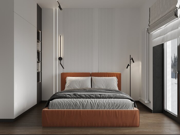 Планировка простая: кровать в центре, свободный проход с обеих сторон, рядом прикроватные тумбы и освещение для чтения. Здесь всё настроено на отдых — минимум деталей, приятные материалы и продуманное расположение мебели.