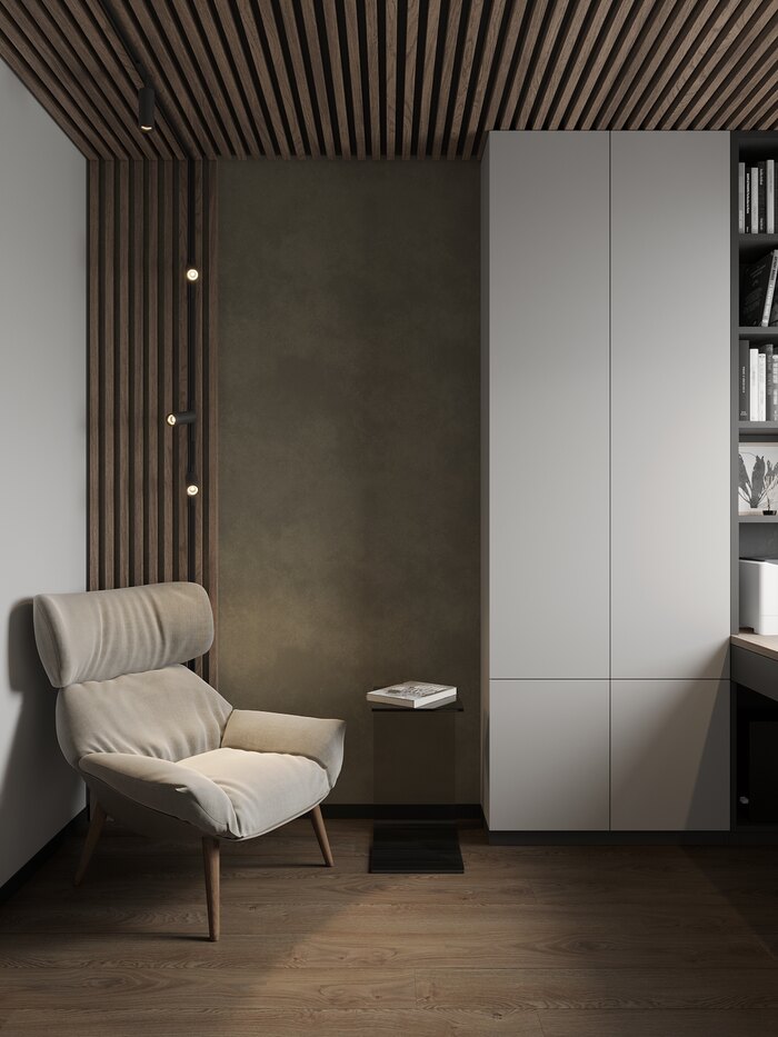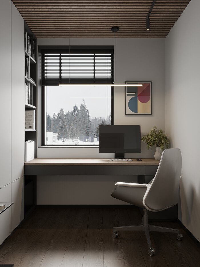 Потолок оформили деревянной рейкой — это перекликается с элементами фасада дома и решает задачу по разным финишным материалам на потолках в разных помещениях. Такое решение добавляет тепла в интерьер и делает кабинет более уютным для работы.