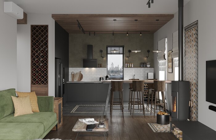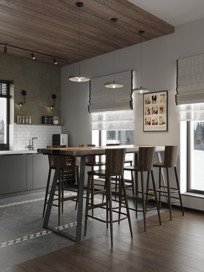 Пол и потолок отделаны так, чтобы кухню было видно как отдельную зону, но при этом она оставалась частью общего пространства с гостиной. Получилось удобно для повседневной жизни и для приёма гостей.