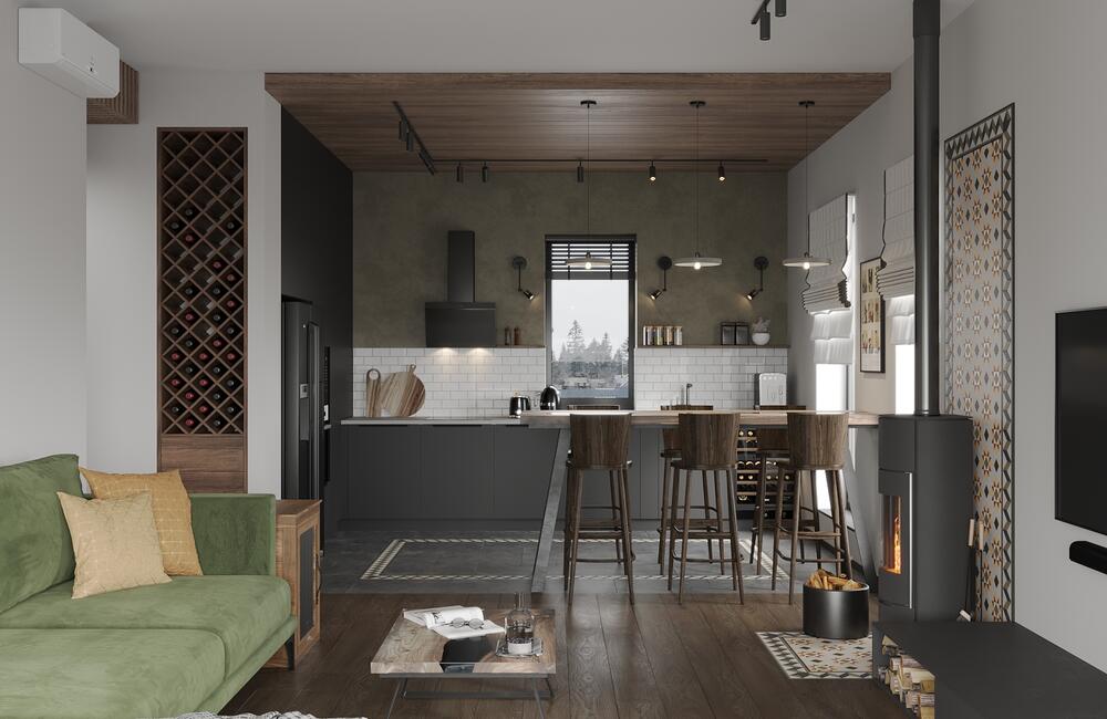 - Дерево — в мебели, потолочных рейках, отделке камина и систем хранения, добавляет тепла и уюта.