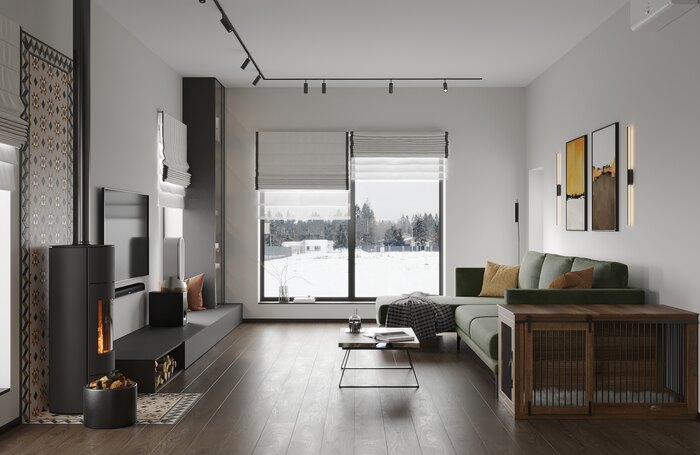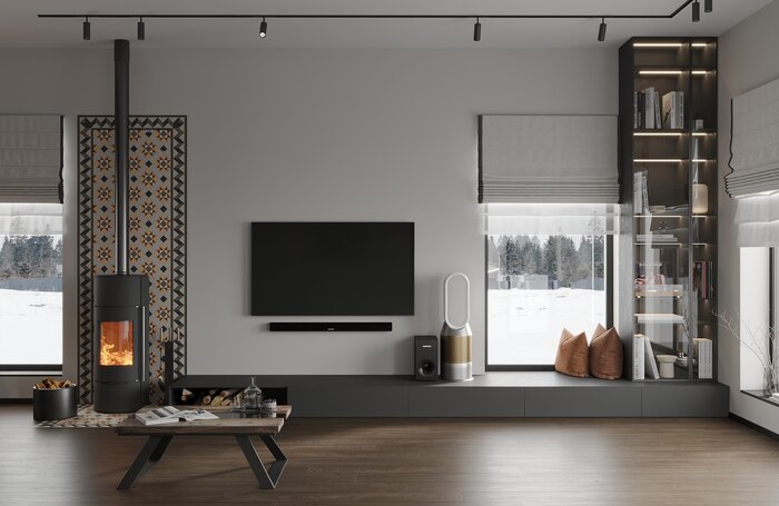 Функционально продумать ТВ-зону, место для винилового проигрывателя и камин