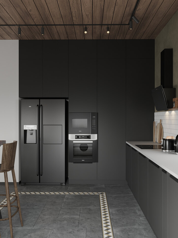 Вся техника спрятана в высоких шкафах до потолка: холодильник side-by-side, духовка, микроволновка и сам винный холодильник. Рабочая зона тянется вдоль одной стены — удобно готовить и убирать.