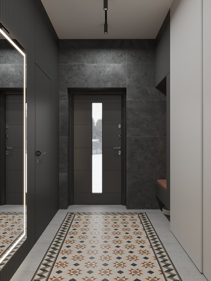 Главный акцент — стена с двумя скрытыми дверями, оформленная рельефными панелями. Благодаря этому дверей почти не видно, и стена выглядит цельной. В центре — зеркало с подсветкой в полный рост, чтобы удобно было проверить образ перед выходом.