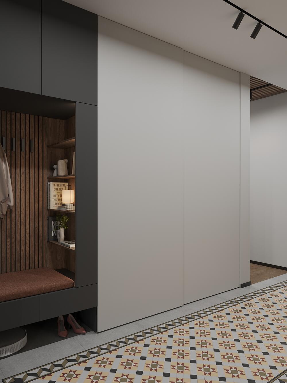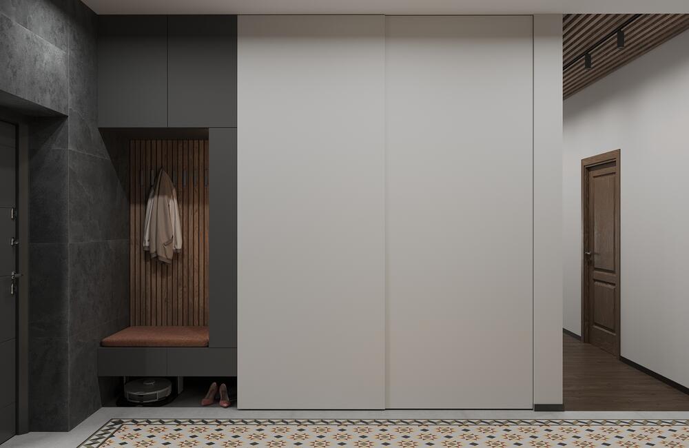 Входную зону сделали функциональной и аккуратной. Слева — ниша с мягким сиденьем и крючками для верхней одежды, внизу есть место для обуви и техники вроде робота-пылесоса. Рядом — большой шкаф-купе для сезонных вещей.