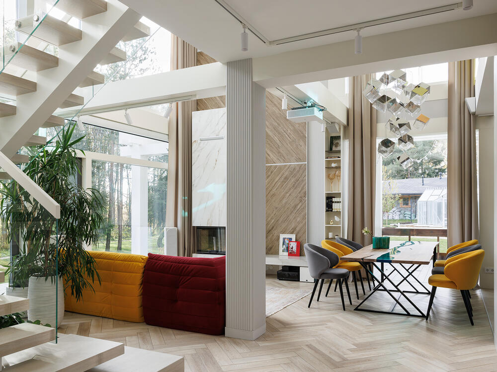 Интерьер загородного дома в Буграх стал отражением индивидуального образа жизни семьи, где продумано всё — от сценариев освещения до авторских деталей. Пространство объединило технологии, природные материалы и архитектурные особенности: витражи, высокие потолки, панорамные окна. Проект реализован без перепланировки, но с глубокой проработкой зонирования, адаптацией под привычки заказчиков и созданием ярких визуальных акцентов. Благодаря нестандартным приёмам — таким как проекционная зона вместо ТВ, витражная перегородка, гидропоника и мебель на заказ — интерьер получился живым, выразительным и наполненным смыслом.