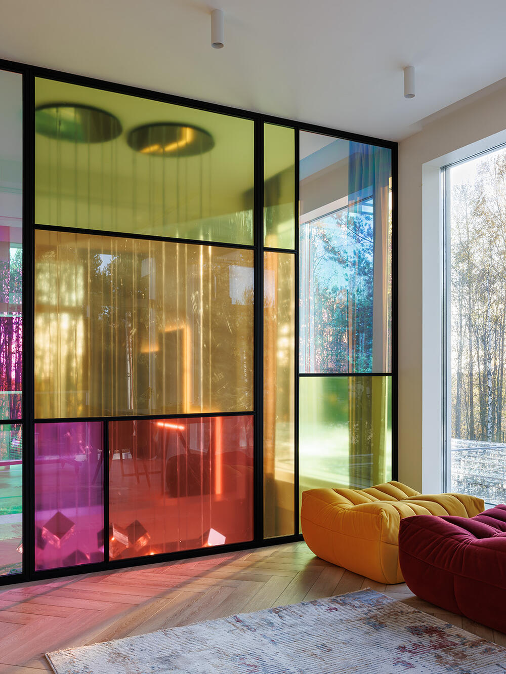 Ключевая идея кабинета — витражная перегородка из цветного стекла, которая в солнечную погоду наполняет дом разноцветными бликами. Это не только зонирующий элемент, но и декоративный акцент. Рабочая зона расположена у панорамного окна, чтобы ничто не мешало обзору и свету. Цветной книжный шкаф с выдвижными модулями добавляет динамики: открытые ячейки можно менять местами, подстраивая под нужды владельцев. В интерьере сочетаются графика, функциональность и тёплая игровая атмосфера.