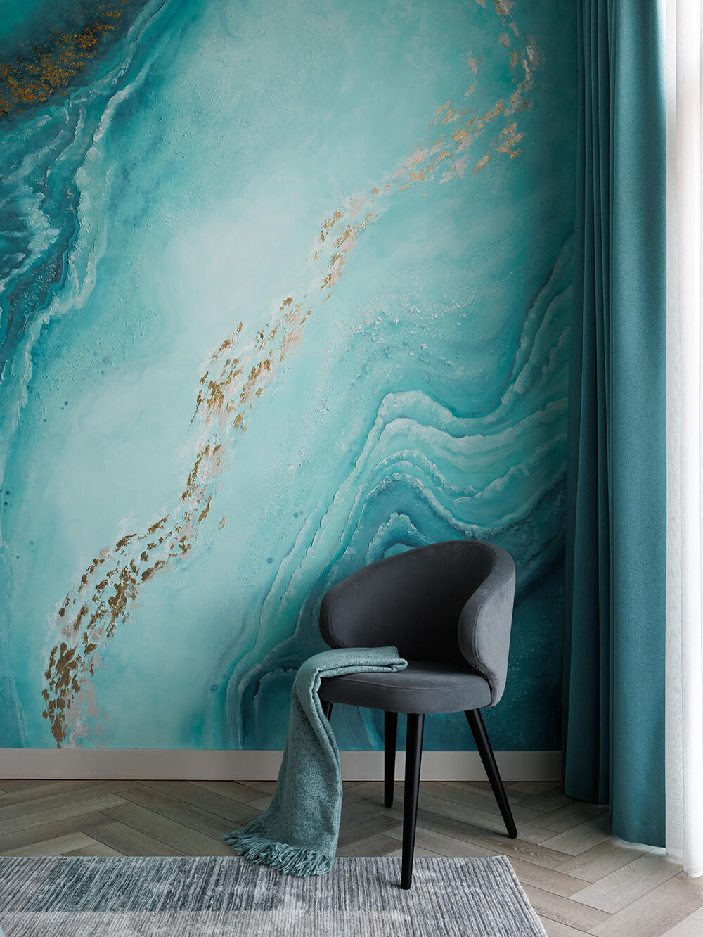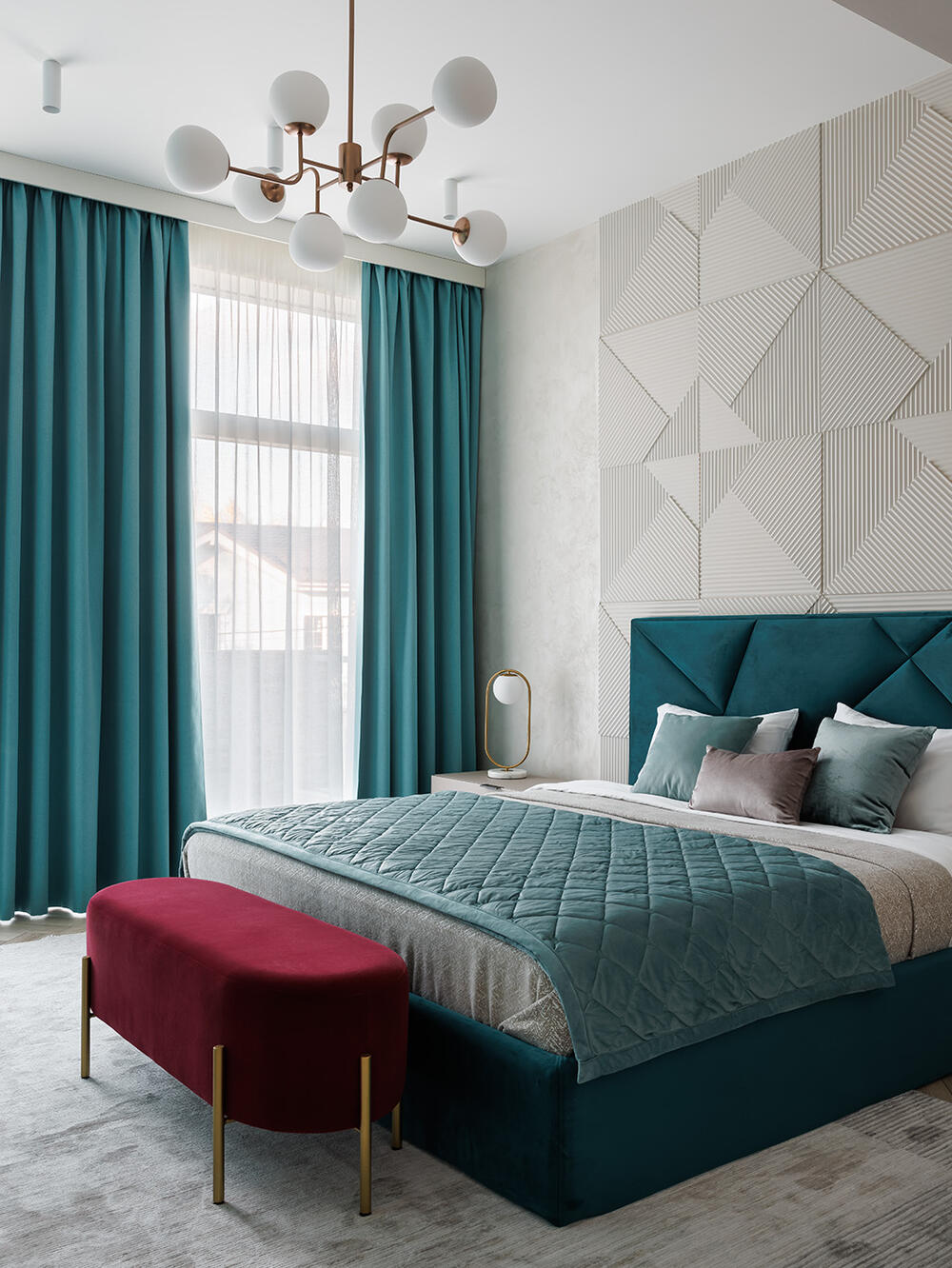 Эта комната словно переносит в отпуск у тёплого моря. Вдохновением послужил вид волн и природных минералов — именно такую динамику передаёт панно с имитацией природного среза в оттенках бирюзы, голубого и песочного, с акцентами золота. Цветовая палитра выстроена на глубоком морском тоне: шторы, мягкое изголовье и покрывало отсылают к морской глади. Контрастной деталью выступает пуф насыщенного винного цвета на золотых ножках — как яркое пятно на фоне спокойной гаммы.
