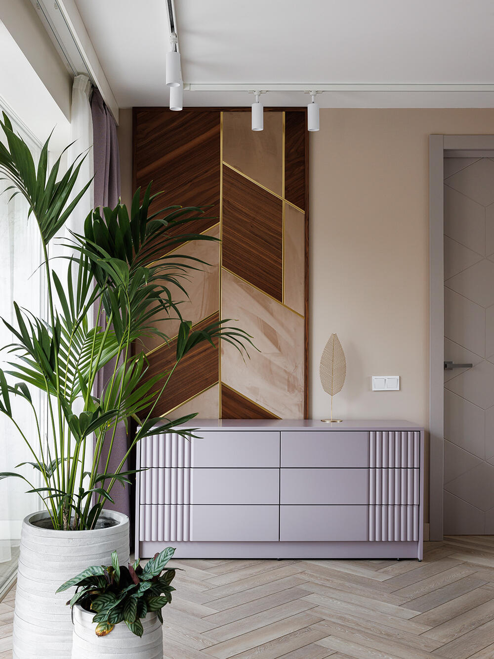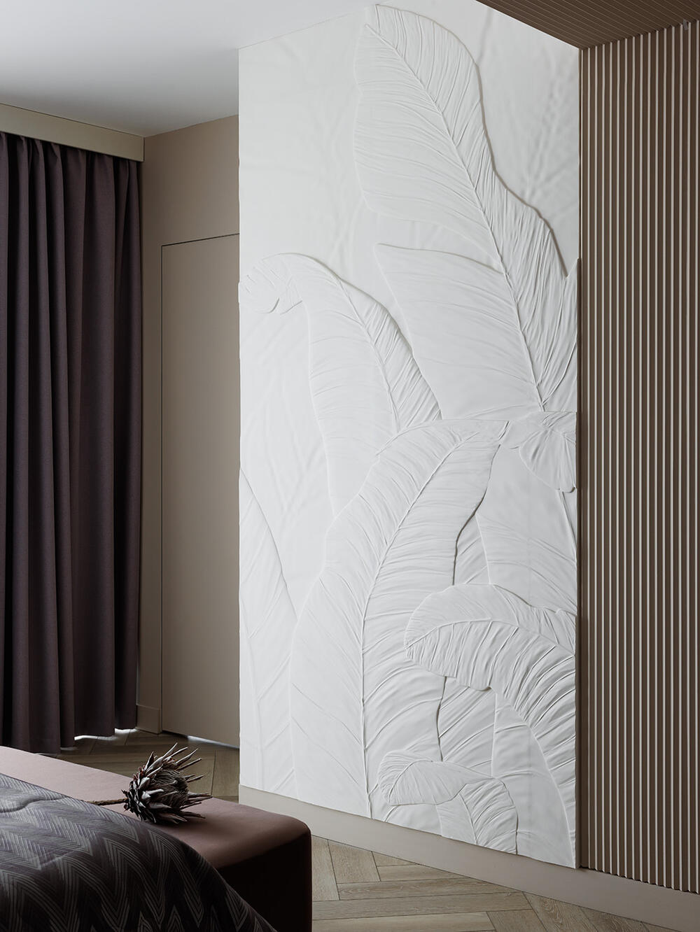 Пространство спальни оформлено в мягкой, пудрово-лавандовой гамме с акцентом на текстуры. Архитектурную балку, проходящую через комнату, оформили 3D-панелью, которая стала частью декоративной композиции и поддержала ритм стен. Панно за изголовьем объединяет дерево, латунные вставки и объёмный орнамент в виде стилизованных перьев — создавая ощущение лёгкости и глубины.