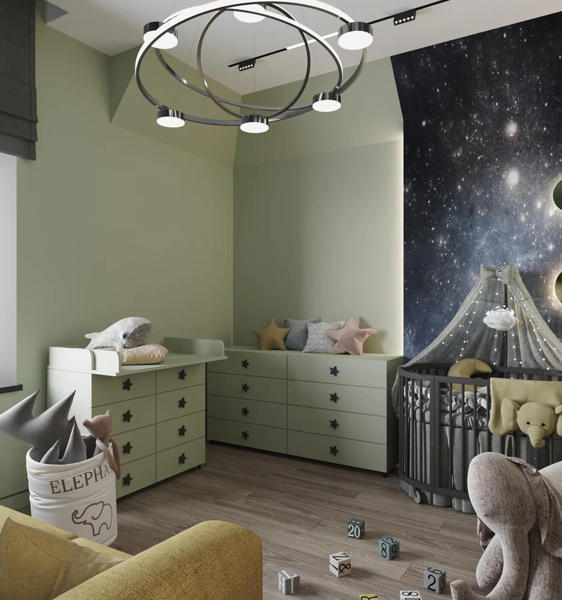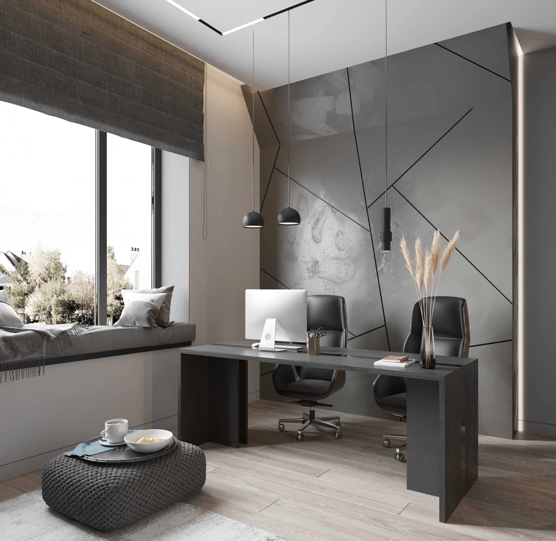 - Серые оттенки в дизайне и яркие акценты зеленого и рыжего цветов