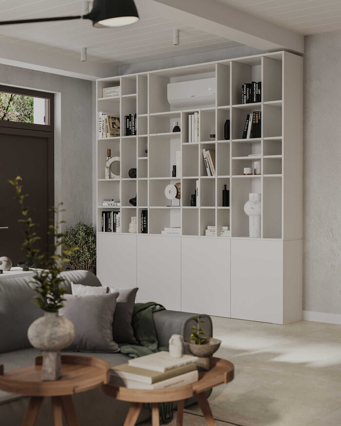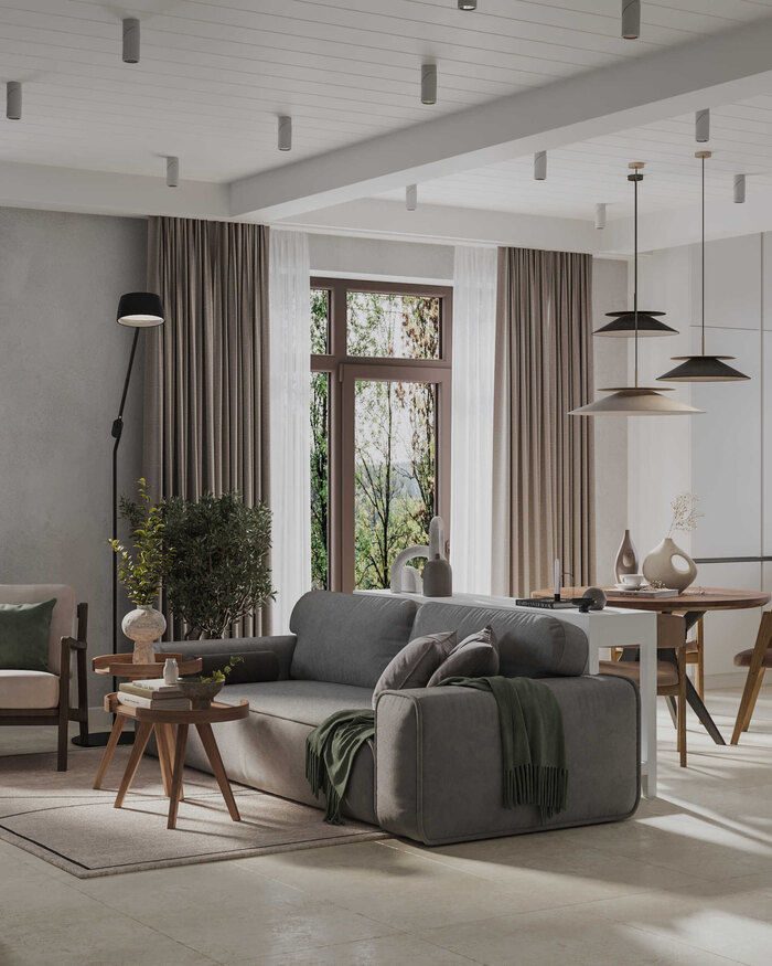 Мы разместили мягкую группу так, чтобы она формировала центр композиции и не мешала проходам. Диван ориентирован внутрь пространства — к зоне общения и отдыха, что делает гостиную удобной для семейных встреч и спокойных вечеров. Мебель подобрана лаконичная, без лишних деталей, чтобы поддержать ощущение воздуха и простора.