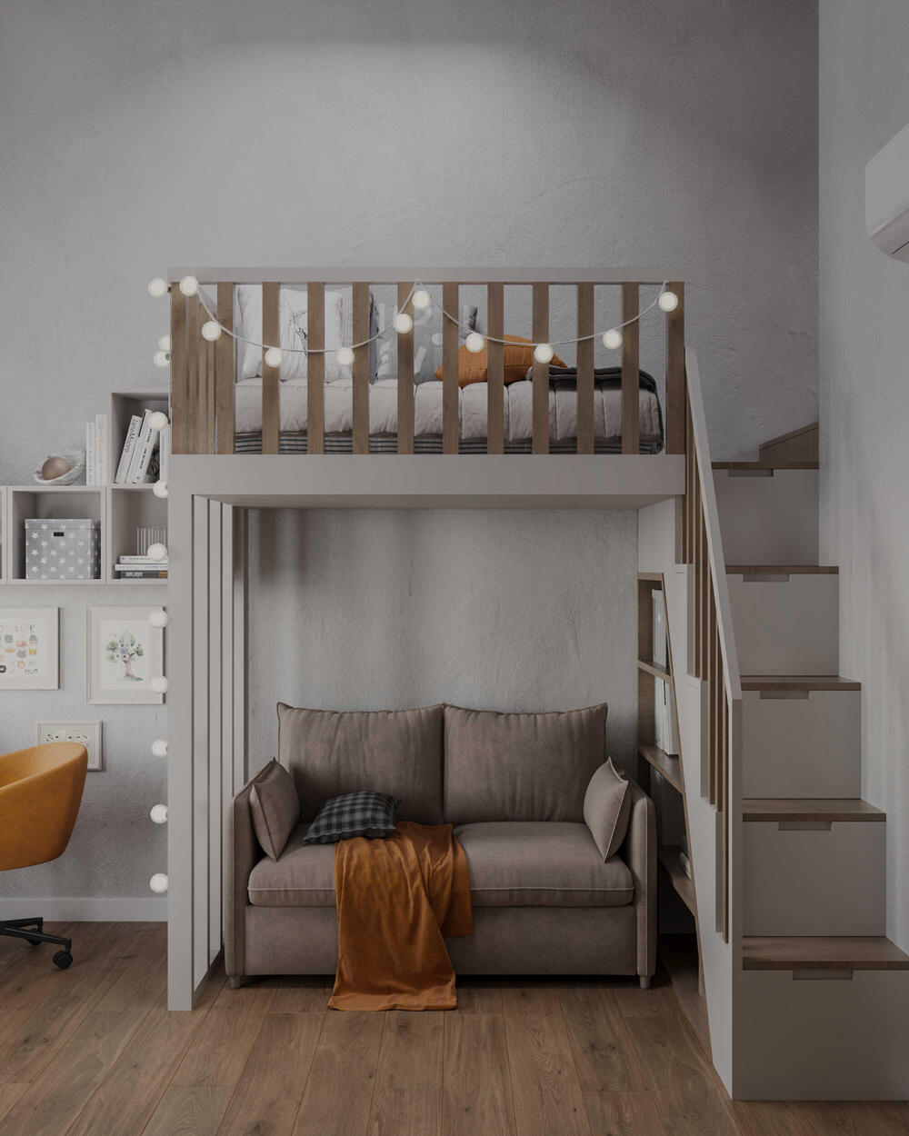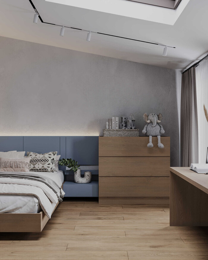 Основной уровень комнаты включает спальное место и зону хранения. Цвет добавлен именно здесь — мягкие акценты делают интерьер живым, но не утомляющим. Пространство легко трансформируется по мере взросления ребёнка.