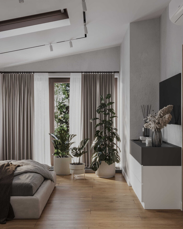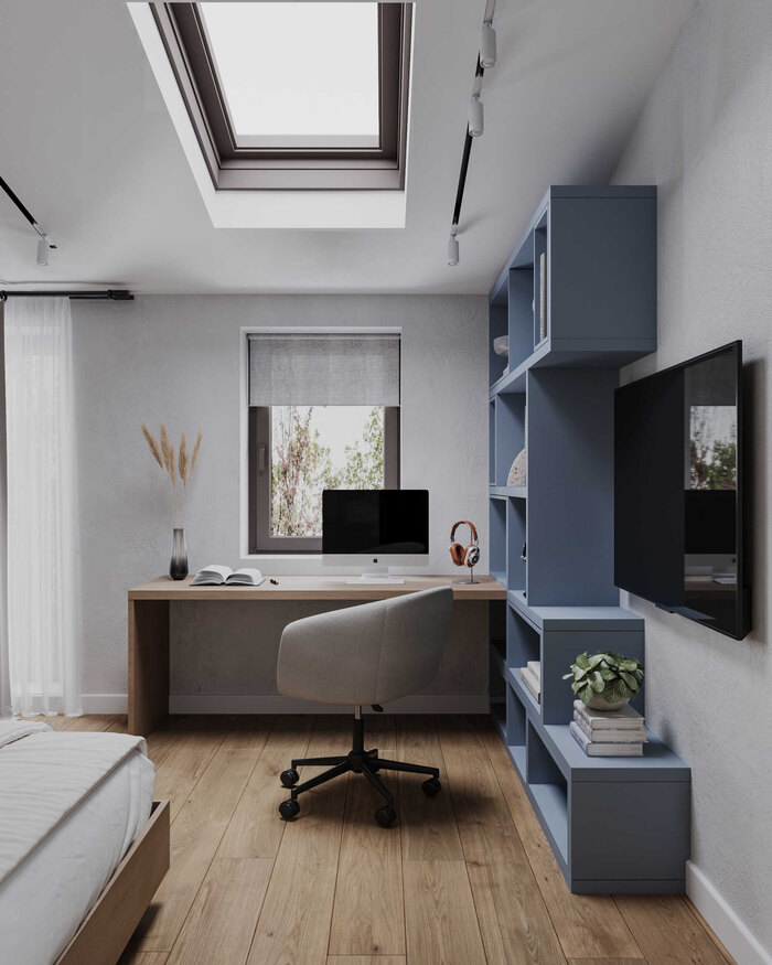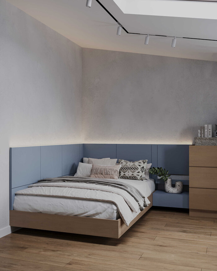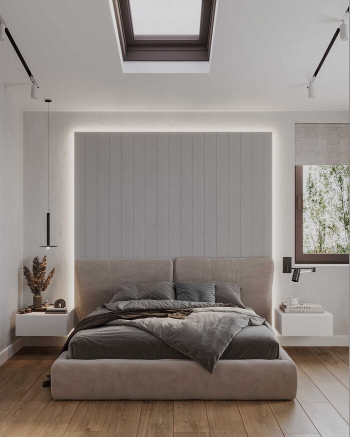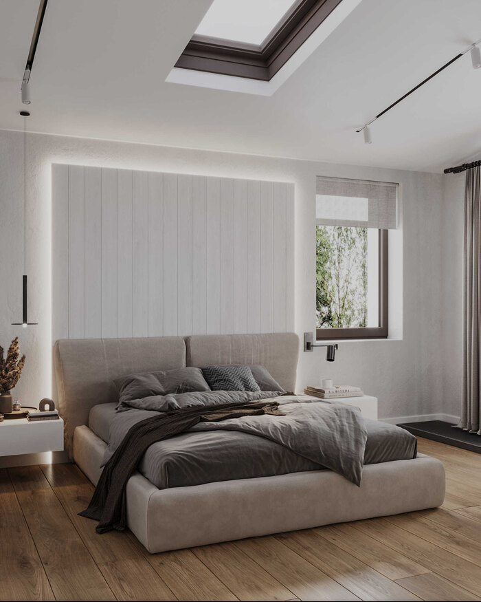 Мансардное окно наполняет комнату естественным светом и визуально расширяет объём, делая спальню более лёгкой и воздушной. Функциональность продумана в деталях: прикроватные зоны организованы для хранения мелочей, а отделка и материалы не требуют сложного ухода и подходят для регулярного использования.