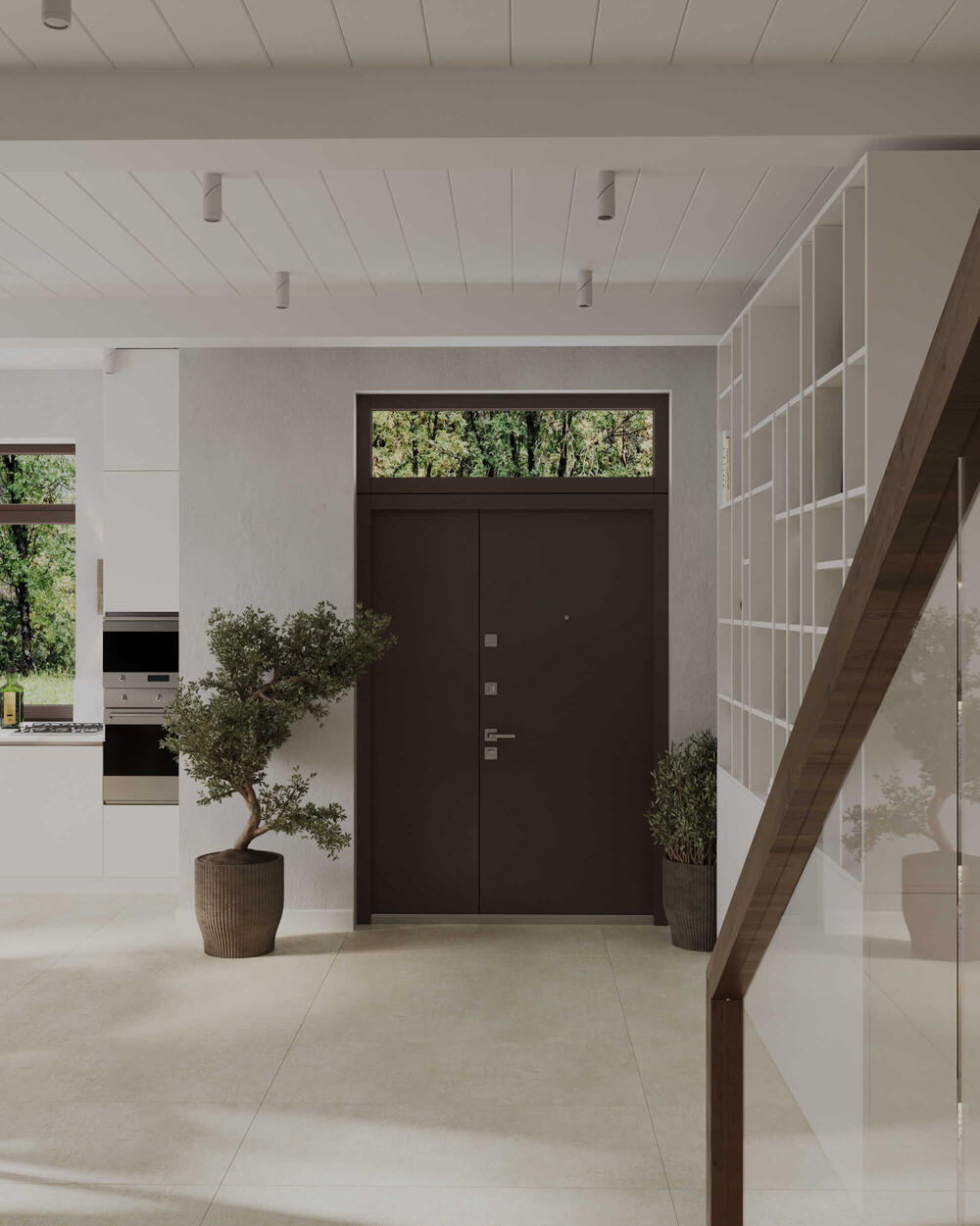 Полы выполнены из керамогранита и кварц-винила. Эти покрытия удобны в повседневной эксплуатации, просты в уходе и отлично подходят для использования с тёплым полом. Такое сочетание материалов позволяет сохранить единый стиль во всём доме и при этом учитывать функциональные особенности разных зон.