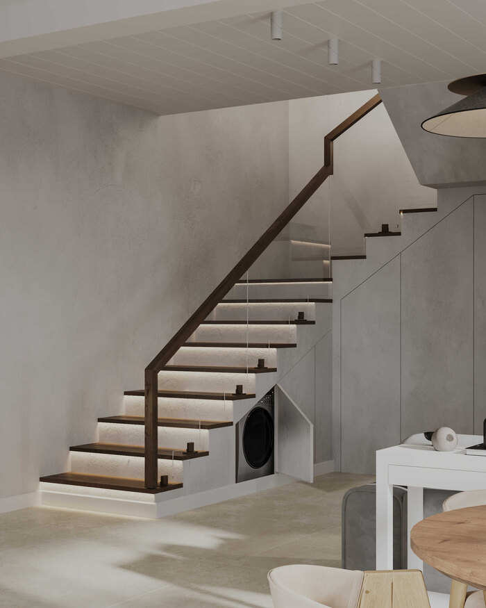 Под лестницей мы организовали хозблок, используя всю глубину конструкции. Здесь разместились стиральная и сушильная машины, а также системы хранения для бытовых принадлежностей. Фасады выполнены в едином стиле с остальной мебелью первого этажа, поэтому блок не привлекает лишнего внимания и выглядит как часть архитектуры пространства.
